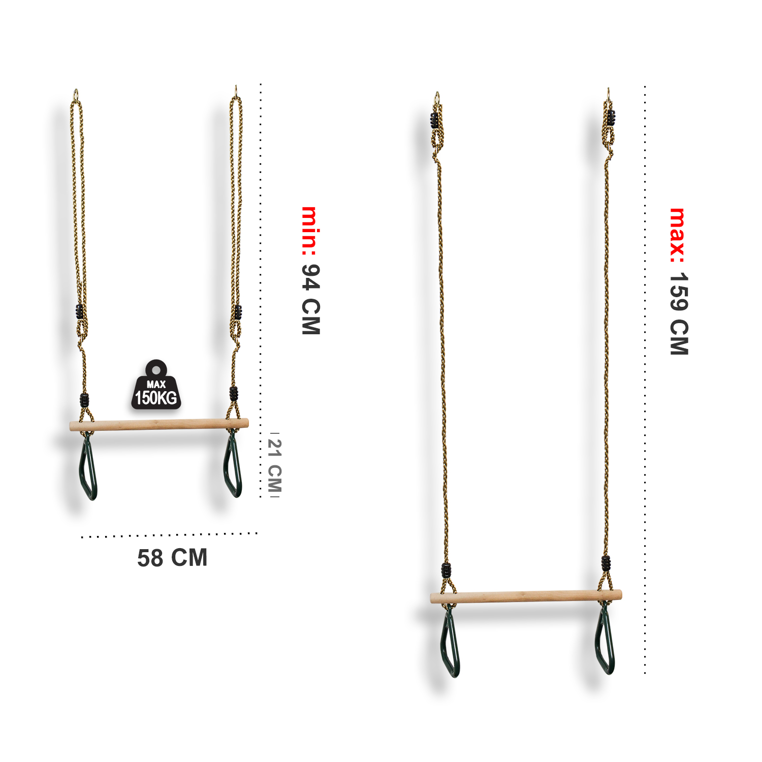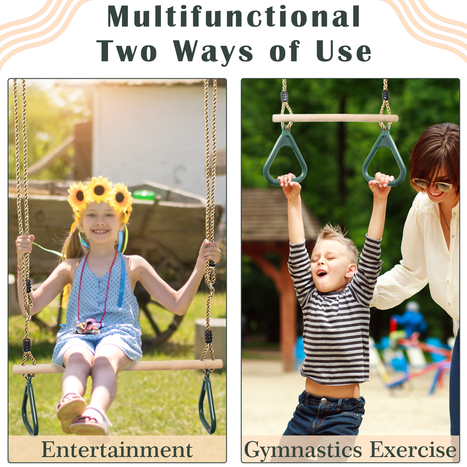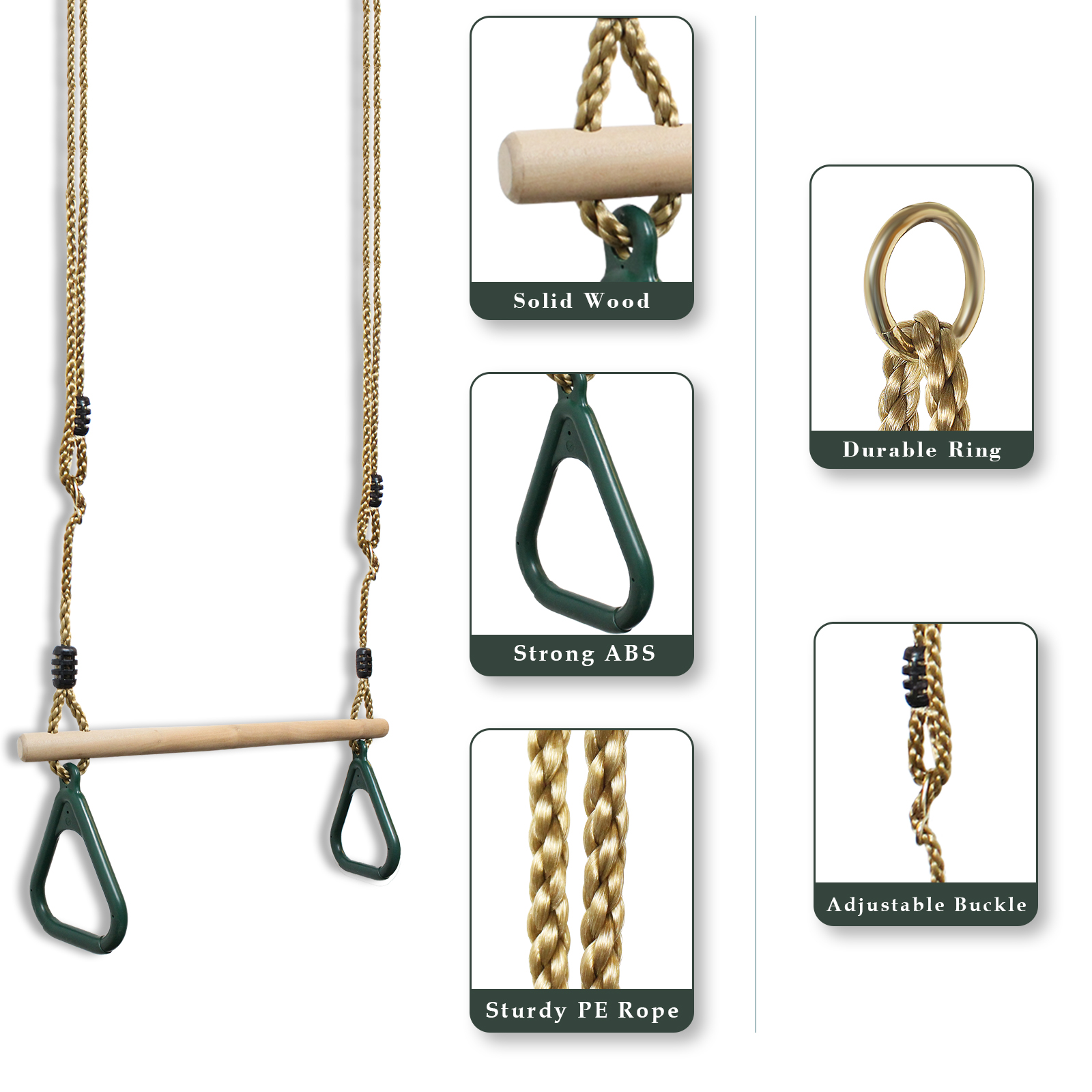 Offrez des heures de jeu actif à votre enfant avec cet ensemble trapézo?dal et anneaux de qualité supérieure. Sécurisez facilement cet ensemble sur nimporte quel cadre descalade ou de balan?oire avec des verrous solides et sécurisés pour mousqueton. Regardez votre enfant exprimer son talent dartiste de cirque ou gymnaste, tout en développant sa force et sa coordination. Fabriquée en bois dur traité, le trapèze est sans éclat et durable. Les cordes élastiques sont en polyéthylène pour réduire les frictions et les risques de br?lure. Fabriqués en plastique moulé résistant aux intempéries, les anneaux robustes assurent une prise en main s?re.