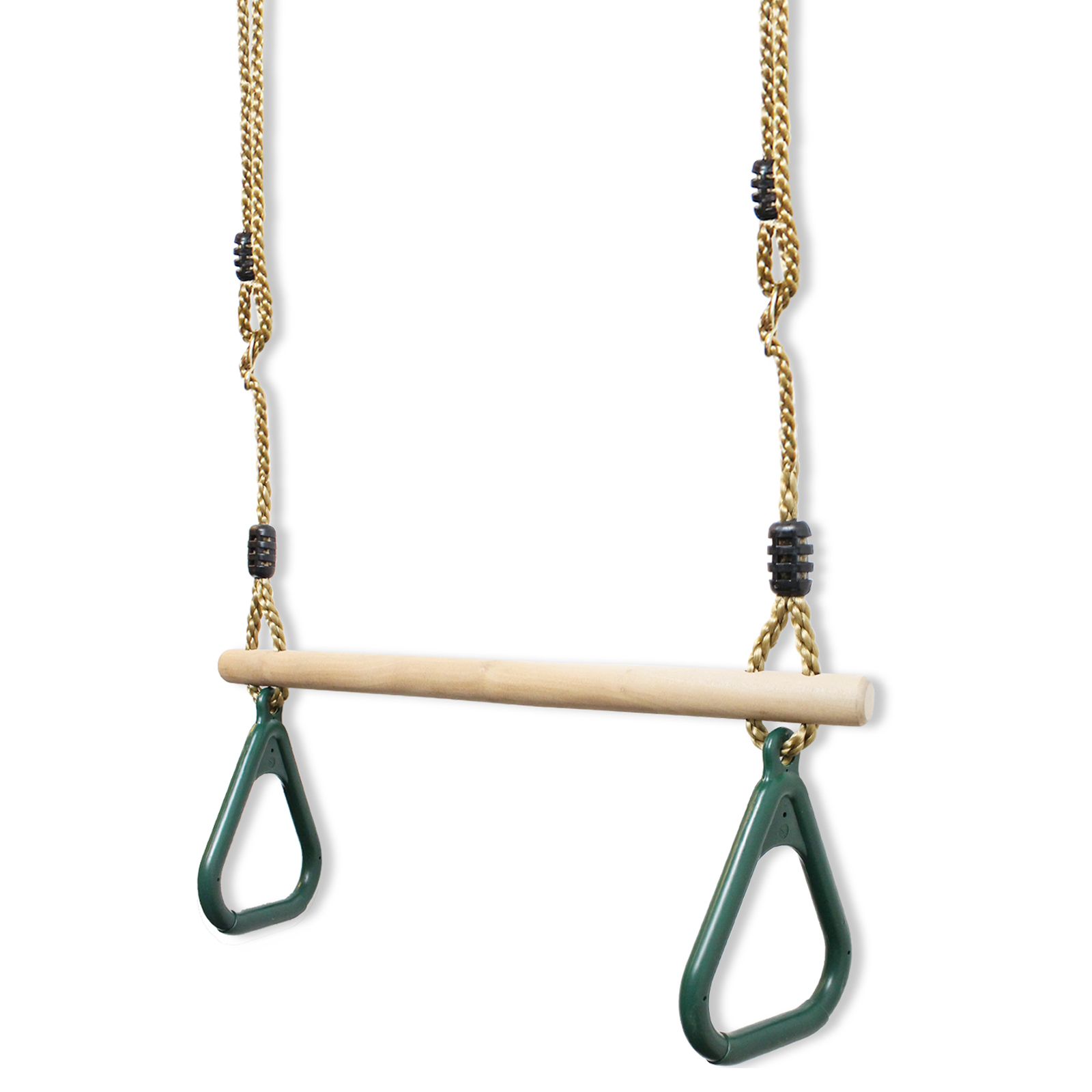 Offrez des heures de jeu actif à votre enfant avec cet ensemble trapézo?dal et anneaux de qualité supérieure. Sécurisez facilement cet ensemble sur nimporte quel cadre descalade ou de balan?oire avec des verrous solides et sécurisés pour mousqueton. Regardez votre enfant exprimer son talent dartiste de cirque ou gymnaste, tout en développant sa force et sa coordination. Fabriquée en bois dur traité, le trapèze est sans éclat et durable. Les cordes élastiques sont en polyéthylène pour réduire les frictions et les risques de br?lure. Fabriqués en plastique moulé résistant aux intempéries, les anneaux robustes assurent une prise en main s?re.