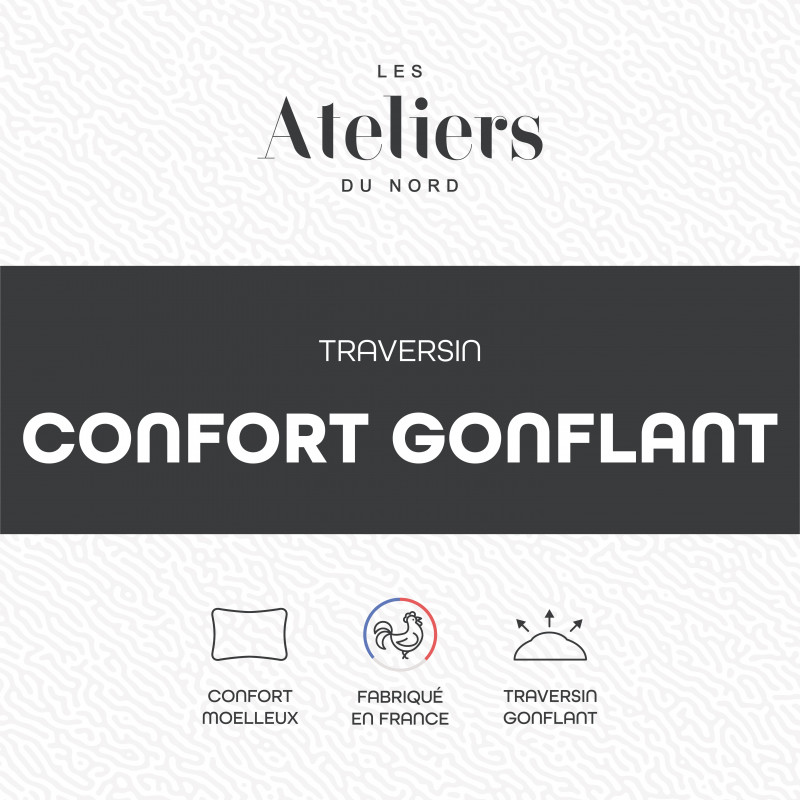 Le traversin Confort Gonflant des Ateliers du Nord se compose d'une enveloppe douce 100% coton et d'un garnissage Polyester fibre creuse siliconée Isolane. Ce polochon vous assure un confort moelleux, idéal pour vous détendre en position assise dans le lit. Avec son joli gonflant, il est aussi décoratif que confortable et il apportera la touche finale à votre lit.