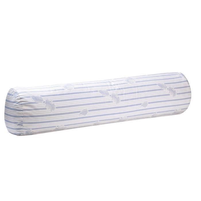 Traversin en Plumes de coloris blanc rayé bleu ciel Enveloppe en calle rayée 70% coton et 30% polyester. Garnissage : 100% plumes véritables. Sous packaging BLANREVE. Dimensions : 140 cm. Lavage a 40°C.