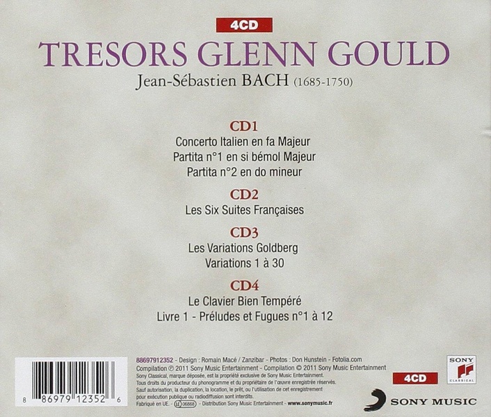 | Liste des pistes | 4.1 . the well-tempered clavier i, no.1 in c major, bwv 846: i. praeludium - Gould, Glenn 4.2 . the well-tempered clavier i, no.1 in c major, bwv 846: ii. fuga - Gould, Glenn 4.3 . the well-tempered clavier i, no.2 in c minor, bwv 847: i. praeludium - Gould, Glenn 4.4 . the well-tempered clavier i, no.2 in c minor, bwv 847: ii. fuga - Gould, Glenn 4.5 . the well-tempered clavier i, no.3 in c sharp major, bwv 848: i. praeludium - Gould, Glenn 4.6 . the well-tempered clavier i, no.3 in c sharp major, bwv 848: ii. fuga - Gould, Glenn 4.7 . the well-tempered clavier i, no.4 in c sharp minor, bwv 849: i. praeludium - Gould, Glenn 4.8 . the well-tempered clavier i, no.4 in c sharp minor, bwv 849: ii. fuga - Gould, Glenn 4.9 . the well-tempered clavier i, no.5 in d major, bwv 850: i. praeludium - Gould, Glenn 4.10 . the well-tempered clavier i, no.5 in d major, bwv 850: ii. fuga - Gould, Glenn 4.11 . the well-tempered clavier i, no.6 in d minor, bwv 851: i. praeludium - Gould, Glenn 4.12 . the well-tempered clavier i, no.6 in d minor, bwv 851: ii. fuga - Gould, Glenn 4.13 . the well-tempered clavier i, no.7 in e flat major, bwv 852: i. praeludium - Gould, Glenn 4.14 . the well-tempered clavier i, no.7 in e flat major, bwv 852: ii. fuga - Gould, Glenn 4.15 . the well-tempered clavier i, no.8 in e flat minor, bwv 853: i. praeludium - Gould, Glenn 4.16 . the well-tempered clavier i, no.8 in d sharp minor, bwv 853: ii. fuga - Gould, Glenn 4.17 . the well-tempered clavier i, no.9 in e major, bwv 854: i. praeludium - Gould, Glenn 4.18 . the well-tempered clavier i, no.9 in e major, bwv 854: ii. fuga - Gould, Glenn 4.19 . the well-tempered clavier i, no.10 in e minor, bwv 855: i. praeludium - Gould, Glenn 4.20 . the well-tempered clavier i, no.10 in e minor, bwv 855: ii. fuga - Gould, Glenn 4.21 . the well-tempered clavier i, no.11 in f major, bwv 856: i. praeludium - Gould, Glenn 4.22 . the well-tempered clavier i, no.11 in f major, bwv 856: ii. fuga - Gould, Glenn 4.23 . the well-tempered clavier i, no.12 in f minor, bwv 857: i. praeludium - Gould, Glenn 4.24 . the well-tempered clavier i, no.12 in f minor, bwv 857: ii. fuga - Gould, Glenn 3.1 . aria - Gould, Glenn 3.2 . variatio 1 a 1 clav. - Gould, Glenn 3.3 . variatio 2 a 1 clav. - Gould, Glenn 3.4 . variatio 3 a 1 clav. canone all'unisono - Gould, Glenn 3.5 . variatio 4 a 1 clav. - Gould, Glenn 3.6 . variatio 5 a 1 ovvera 2 clav. - Gould, Glenn 3.7 . variatio 6 a 1 clav. canone alla seconda - Gould, Glenn 3.8 . variatio 7 a 1 ovvera 2 clav. - Gould, Glenn 3.9 . variatio 8 a 2 clav. - Gould, Glenn 3.10 . variatio 9 a 1 clav. canone alla terza - Gould, Glenn 3.11 . variatio 10 a 1 clav. fughetta - Gould, Glenn 3.12 . variatio 11 a 2 clav. - Gould, Glenn 3.13 . variatio 12 canone alla quarta - Gould, Glenn 3.14 . variatio 13 a 2 clav. - Gould, Glenn 3.15 . variatio 14 a 2 clav. - Gould, Glenn 3.16 . variatio 15 a 1 clav. canone alla quinta. andante - Gould, Glenn 3.17 . variatio 16 a 1 clav. ouverture - Gould, Glenn 3.18 . variatio 17 a 2 clav. - Gould, Glenn 3.19 . variatio 18 a 1 clav. canone alla sesta - Gould, Glenn 3.20 . variatio 19 a 1 clav. - Gould, Glenn 3.21 . variatio 20 a 2 clav. - Gould, Glenn 3.22 . variatio 21 canone alla settima - Gould, Glenn 3.23 . variatio 22 a 1 clav. alla breve - Gould, Glenn 3.24 . variatio 23 a 2 clav. - Gould, Glenn 3.25 . variatio 24 a 1 clav. canone all'ottava - Gould, Glenn 3.26 . variatio 25 a 2 clav. - Gould, Glenn 3.27 . variatio 26 a 2 clav. - Gould, Glenn 3.28 . variatio 27 a 2 clav. canone alla nona - Gould, Glenn 3.29 . variatio 28 a 2 clav. - Gould, Glenn 3.30 . variatio 29 a 1 ovvero 2 clav. - Gould, Glenn 3.31 . variatio 30 a 1 clav. quodlibet - Gould, Glenn 3.32 . aria da capo - Gould, Glenn 2.1 . french suite no. 1 in d minor, bwv 812 i. allemande - Gould, Glenn 2.2 . french suite no. 1 in d minor, bwv 812 ii. courante - Gould, Glenn 2.3 . french suite no. 1 in d minor, bwv 812 iii. sarabande - Gould, Glenn 2.4 . french suite no. 1 in d minor, bwv 812 iv. menuet i - Gould, Glenn 2.5 . french suite no. 1 in d minor, bwv 812 v. menuet ii - Gould, Glenn 2.6 . french suite no. 1 in d minor, bwv 812 vi. gigue - Gould, Glenn 2.7 . french suite no. 2 in c minor, bwv 813 i. allemande - Gould, Glenn 2.8 . french suite no. 2 in c minor, bwv 813 ii. courante - Gould, Glenn 2.9 . french suite no. 2 in c minor, bwv 813 iii. sarabande - Gould, Glenn 2.10 . french suite no. 2 in c minor, bwv 813 iv. air - Gould, Glenn 2.11 . french suite no. 2 in c minor, bwv 813 v. menuet - Gould, Glenn 2.12 . french suite no. 2 in c minor, bwv 813 vi. gigue - Gould, Glenn 2.13 . french suite no. 3 in b minor, bwv 814 i. allemande - Gould, Glenn 2.14 . french suite no. 3 in b minor, bwv 814 ii. courante - Gould, Glenn 2.15 . french suite no. 3 in b minor, bwv 814 iii. sarabande - Gould, Glenn 2.16 . french suite no. 3 in b minor, bwv 814 iv. menuet trio - Gould, Glenn 2.17 . french suite no. 3 in b minor, bwv 814 v. anglaise - Gould, Glenn 2.18 . french suite no. 3 in b minor, bwv 814 vi. gigue - Gould, Glenn 2.19 . french suite no. 4 in e-flat major, bwv 815 i. allemande - Gould, Glenn 2.20 . french suite no. 4 in e-flat major, bwv 815 ii. courante - Gould, Glenn 2.21 . french suite no. 4 in e-flat major, bwv 815 iii. sarabande - Gould, Glenn 2.22 . french suite no. 4 in e-flat major, bwv 815a iv. menuet - Gould, Glenn 2.23 . french suite no. 4 in e-flat major, bwv 815 v. gavotte - Gould, Glenn 2.24 . french suite no. 4 in e-flat major, bwv 815 vi. air - Gould, Glenn 2.25 . french suite no. 4 in e-flat major, bwv 815 vii. gigue - Gould, Glenn 2.26 . french suite no. 5 in g major, bwv 816 i. allemande - Gould, Glenn 2.27 . french suite no. 5 in g major, bwv 816 ii. courante - Gould, Glenn 2.28 . french suite no. 5 in g major, bwv 816 iii. sarabande - Gould, Glenn 2.29 . french suite no. 5 in g major, bwv 816 iv. gavotte - Gould, Glenn 2.30 . french suite no. 5 in g major, bwv 816 v. bourée - Gould, Gle