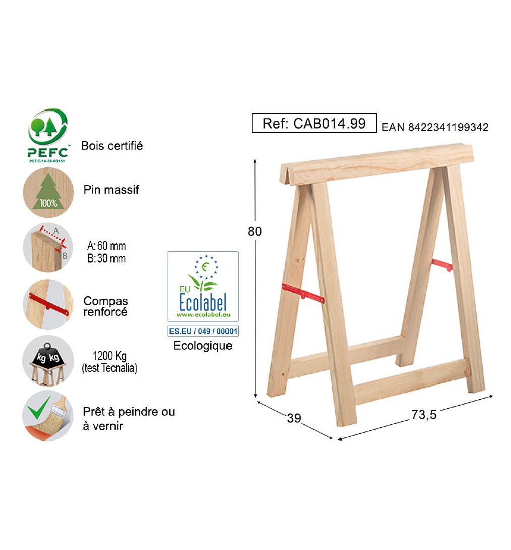 Résistant, robuste, solide, rigide, durable... Tel est le tréteau en pin Professionnel Plus. Ses pieds font 60x30mm d'épaisseur. Pensez à tous les projets de bricolage que vous pourrez réaliser vous-même avec deux de ces tréteaux et un plateau ! Le tréteau dispose d'un compas métallique qui permet de le plier et a une hauteur de 80 cm, ce qui en fait le support idéal pour créer une table ou un établi résistant et stable, pour un atelier ou un garage. Le tréteau permet une grande capacité de charge. Deux unités supportent jusqu'à 1 000 kg. Une fois les deux tréteaux et le plateau assemblés, vous pouvez ajouter à la table une étagère supplémentaire sur la partie inférieure afin d’augmenter l’espace de rangement pour vos outils ou tout ce dont vous avez besoin pour vos travaux de bricolage. Le bois de ce tréteau est doublement certifié : l'écolabel de l'Union européenne et le PEFC. Cette certification atteste que le bois d’Astigarraga Kit Line provient d'une gestion responsable des forêts locales et durabl