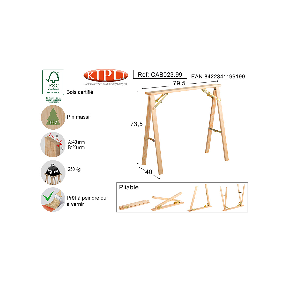 | Libellé | Tréteau pliable en bois de pin de Kipli (250 kg) (73,5x79,5x40 cm) |