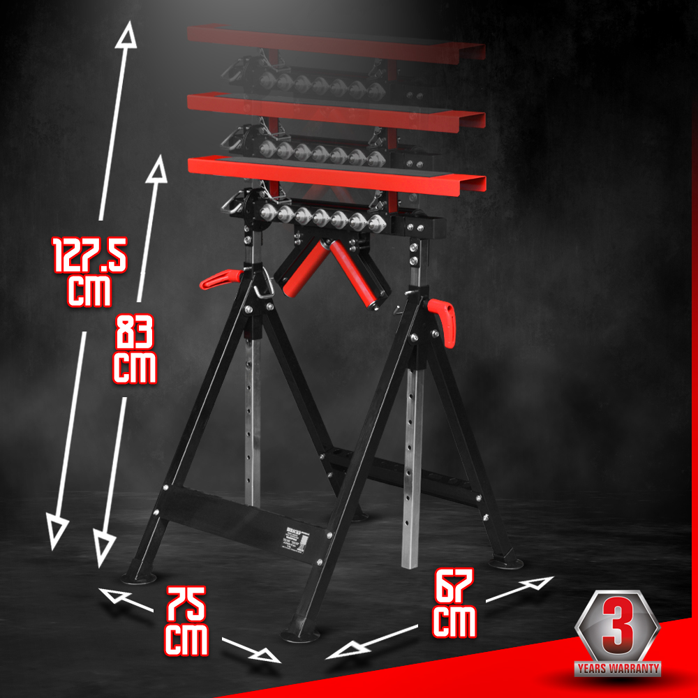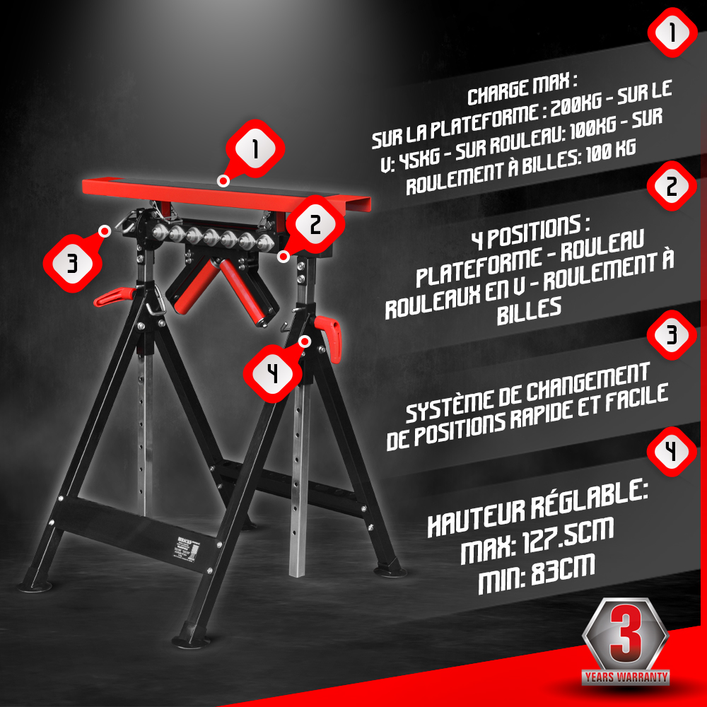 Treteau telescopique a rouleaux - Max 200kg, 4 Positions, Hauteur réglable 83 à 127,5 cm - Brick