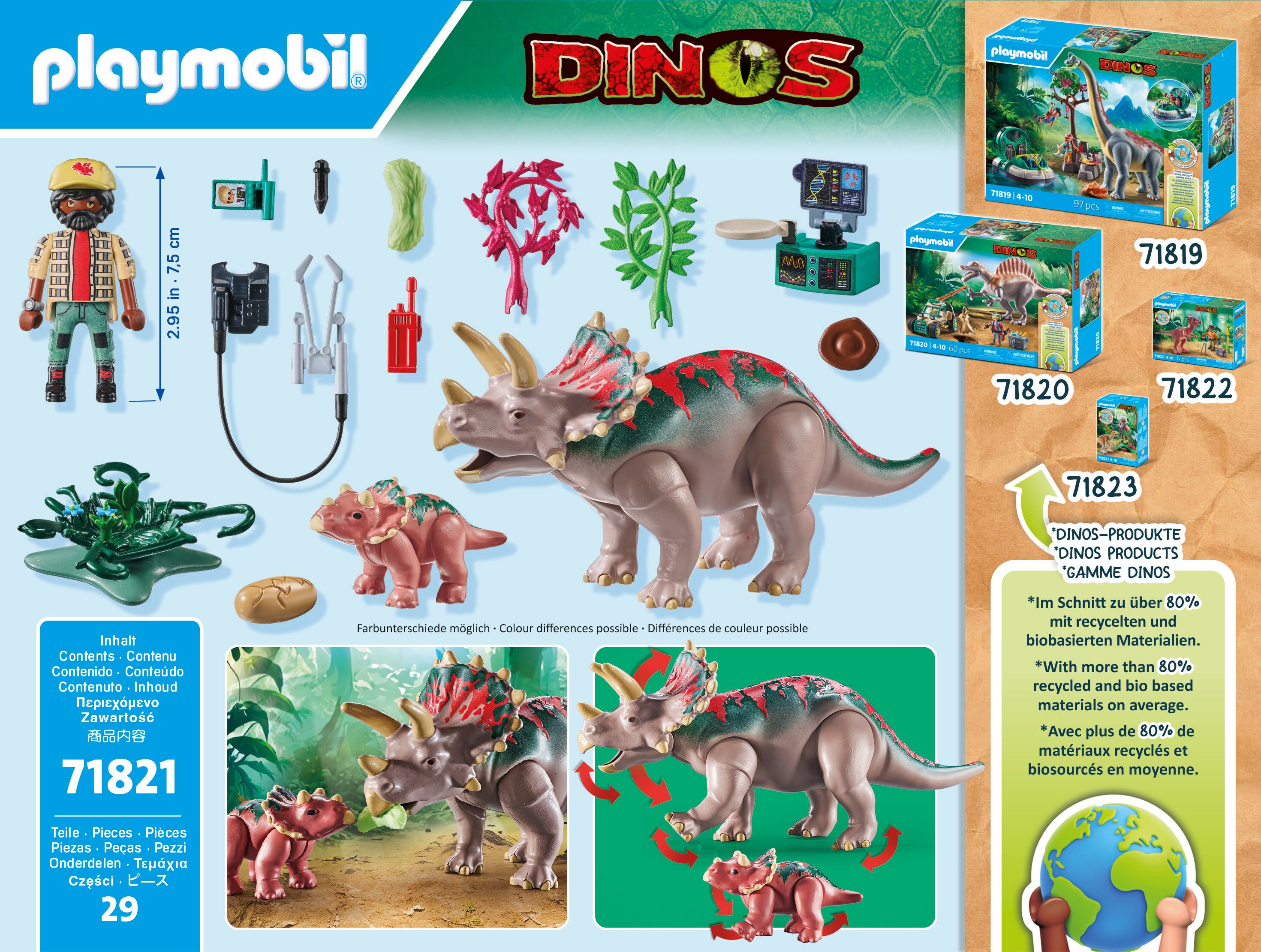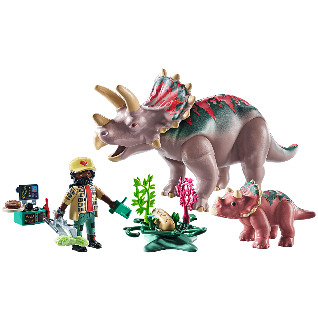Personnage : 1 homme Animaux : 1 Triceratops, 1 Triceratops juvénile Accessoires : 1 plaque de base, 2 petites feuilles, 2 branches, 2 fleurs, 1 talkie-walkie, 1 pain plat, 1 œuf, 1 piédestal, 1 étagère, 1 nid, 1 stylo, 2 adaptateurs, 2 présentoirs, 1 partie d'herbe, 1 tuyau, 1 grappin, 1 plastron, 1 casquette, 1 montre-bracelet