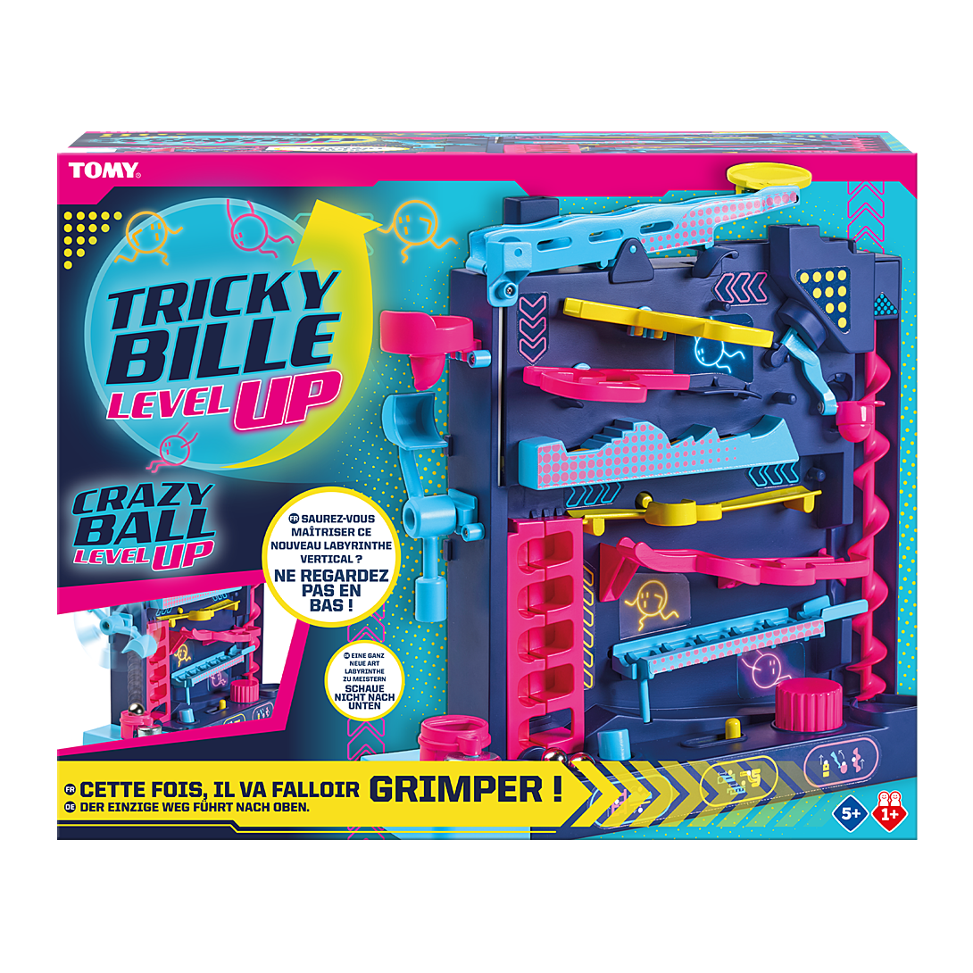 "Préparez-vous à de nouvelles aventures renversantes avec Tricky Bille Level Up ! Vous allez pouvoir défier les lois de la gravité en passant de l’horizontale à la verticale. Commencez en bas et faites remonter votre bille le long de la structure, en franchissant plus d’une douzaine de défis, dont certains à deux reprises ! La base ne comporte que trois commandes que vous devrez actionner, tourner et effleurer pour vous frayer un chemin dans la vis sans fin, sauter par-dessus le pont, un échelon à la fois, et vous faufiler le long de l’échelle, en passant d’un barreau à l’autre. Si vous n’avez pas encore fait tomber votre bille, vous traverserez alors le passage suspendu, sauterez dans des cerceaux, glisserez dans un toboggan, puis remonterez jusqu’au gobelet de lancement. Catapultez cette petite bille jusqu’à deux labyrinthes flottants, passez sur le pont en dents de scie et reprenez votre souffle en vous envolant vers le sommet à l’aide de l’ascenseur. Il y a encore des marches à gravir, un nuage à atteindre et une rampe suspendue. Descendez dans l’entonnoir pour le dernier tour de magie du Tricky Bille et faites sonner la cloche d’arrivée en bas ! Si vous avez aimé les Tricky Bille Original et Niveau 2 (vendus séparément), vous ne pourrez pas résister à l’envie de passer au niveau supérieur et d’atteindre les sommets. En plus le Tricky Bille Level Up se connecte à l'Original et au niveau 2 grâce à la passerelle toboggan incluse. Jouez seul et fixez-vous un temps à battre ou affrontez votre famille et vos amis. Le plus rapide à sortir du labyrinthe gagne. Convient pour 1 à 4 joueurs à partir de 5 ans. Pas besoin de piles. Nécessite un assemblage léger."
