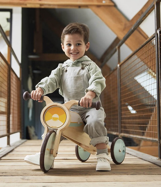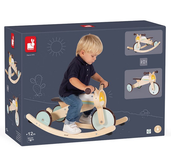 Born to be wild ! Vous avez des petits aventuriers à la maison, qui rêvent d'asphalte et de plaines sauvages ? Voici LA monture idéale pour leur donner le goût de la liberté sans avoir à passer son permis ! Ce tricycle évolutif en bois conviendra aux enfants à partir de 12 mois et pourra les accompagner tout au long de leur croissance jusqu'à leurs 3 ans ! Comment ? En passant d'un jouet à bascule pour bébé à un porteur à trois roues ! Ce jouet en bois se transforme rapidement grâce à sa bascule amovible qui une fois retirée, laisse place à un petit tricycle moto au look rétro ! Après les joies de la bascule et l'appréhension de l'équilibre il pourra s'épanouir et prendre (un peu) de vitesse lorsqu'il s'installera au guidon de son premier tricycle dont la roue avant est directionnelle. Ce tricycle est en bois certifié FSC (bois issu de forêts gérées durablement).