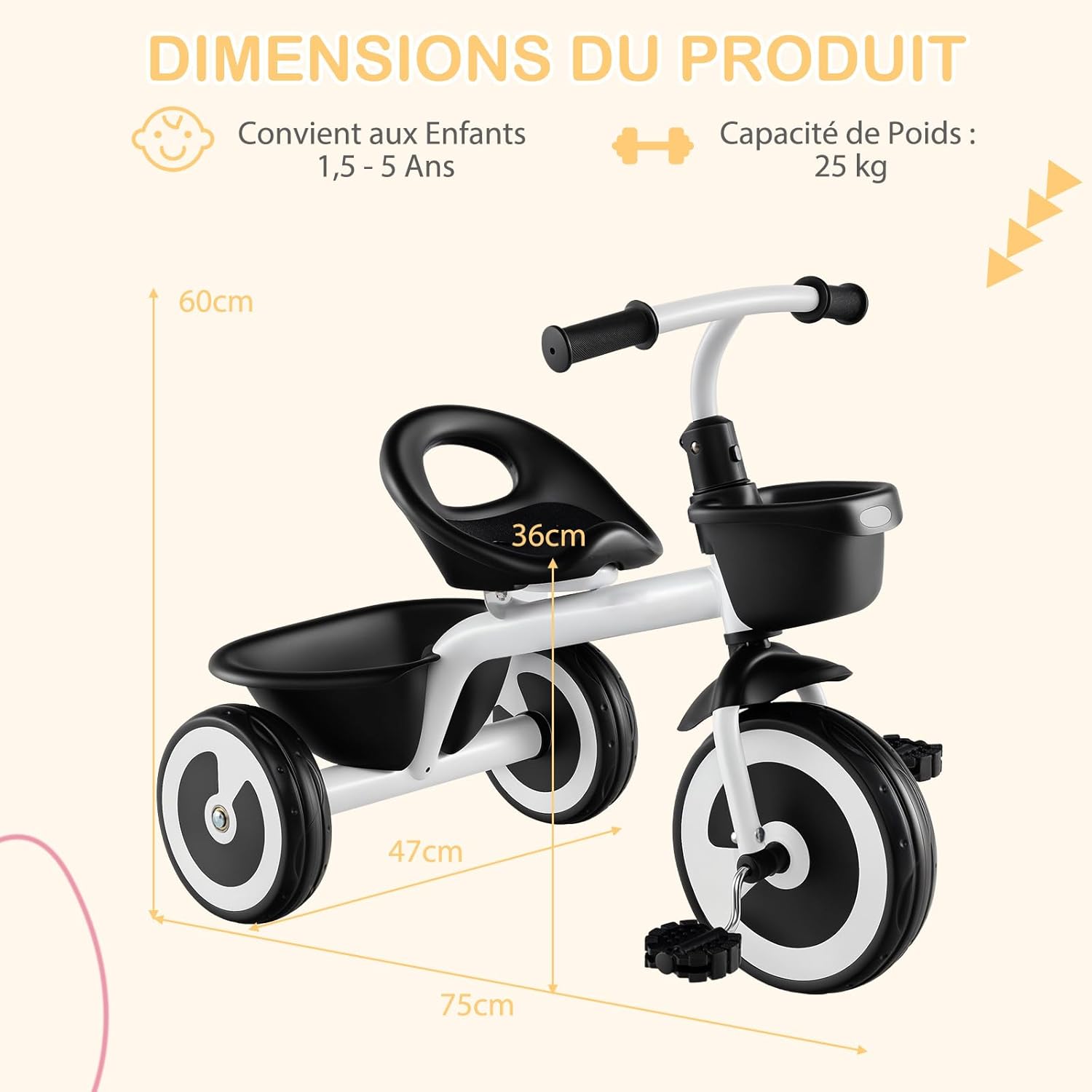 | Libellé | Tricycle enfants de 1,5-5 ans, vélo draisienne bebe avec siège réglable à 2 niveaux,pédales,blanc |