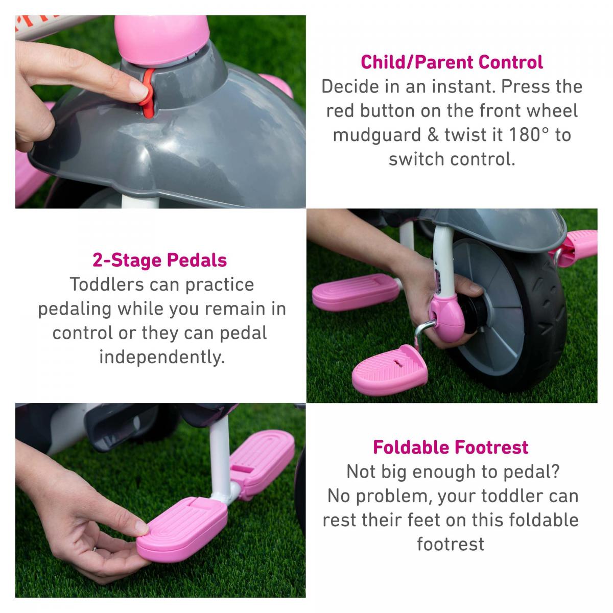Apprend à pédaler. Rabattez le repose-pieds, retirez la barre de sécurité, enclenchez les pédales et utilisez le bouton de contrôle pour passer du contrôle parent à celui de l'enfant afin de développer la motricité tout en apprenant à rouler.