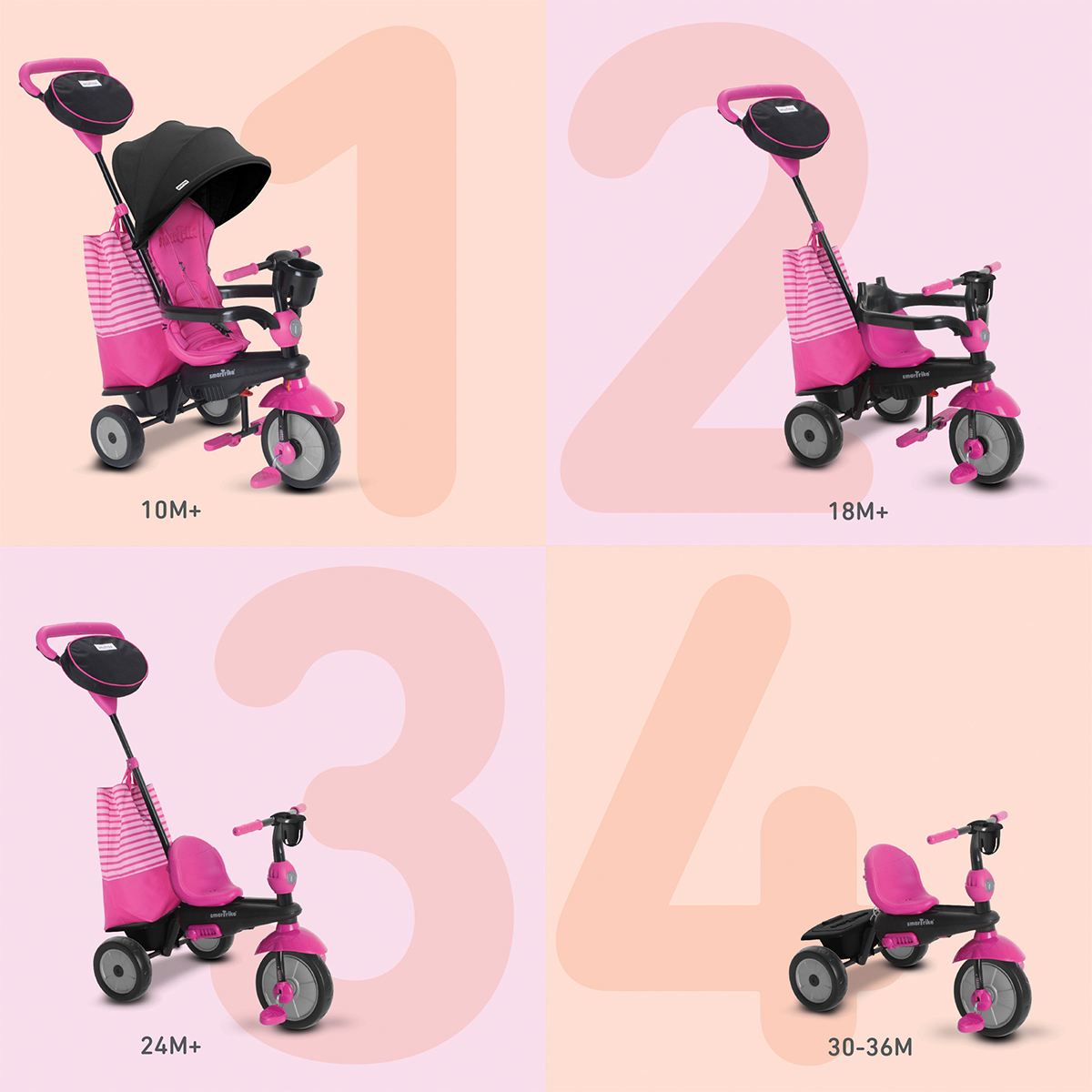 Véritable jouet 4 en 1, le tricycle Swing Rose est signé par la marque Smartrike. Evoluant en même temps que votre bambin, il s'utilise dès l'âge de 10 mois et ce, jusqu'à 36 mois.