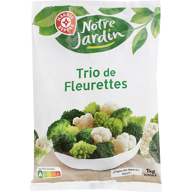 Ingrédients : Chou-fleur (27,2 % mini), brocoli (26,4 % mini), chou romanesco (26,4 % mini).
