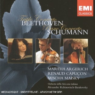 | Liste des pistes | 1.1 . triple concerto, opus 56 : allegro (beethoven ludwig van) - Rabinovitch-Barakovsky, Alexandre,Van Beethoven, Ludwig,Argerich, Martha,Maisky, Mischa 1.2 . triple concerto, opus 56 : largo (beethoven ludwig van) - Rabinovitch-Barakovsky, Alexandre,Van Beethoven, Ludwig,Argerich, Martha,Maisky, Mischa 1.3 . triple concerto, opus 56 : rondo alla polacca (beethoven ludwig van) - Rabinovitch-Barakovsky, Alexandre,Van Beethoven, Ludwig,Argerich, Martha,Maisky, Mischa 1.4 . concerto pour piano, opus 54 : allegro affettuoso (schumann robert) - Rabinovitch-Barakovsky, Alexandre,Argerich, Martha 1.5 . concerto pour piano, opus 54 : intermezzo (schumann robert) - Rabinovitch-Barakovsky, Alexandre,Argerich, Martha 1.6 . concerto pour piano, opus 54 : allegro vivace (schumann robert) - Rabinovitch-Barakovsky, Alexandre,Argerich, Martha |