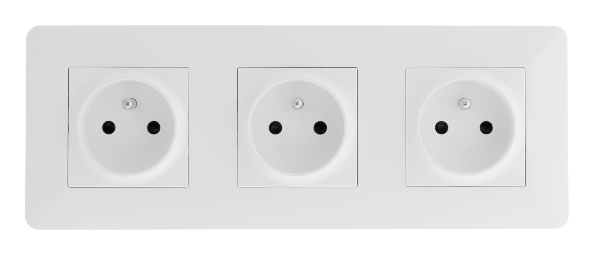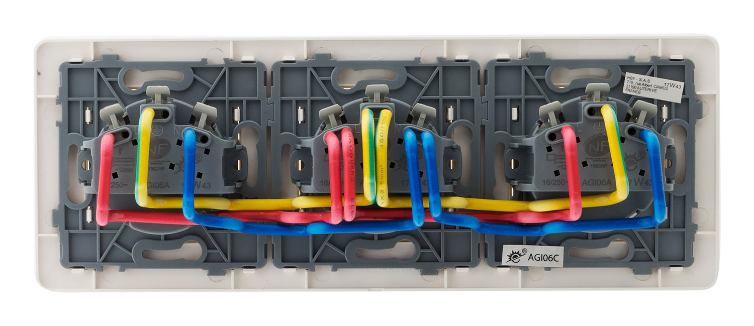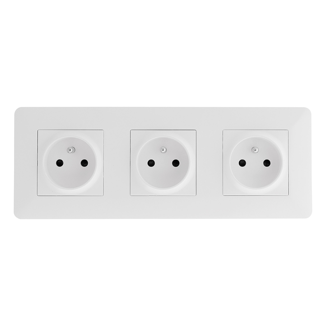 Triple prise 2 pôles + terre coloris blanc fixation vis et griffes bornes automatiques précâblée puissance max. : 3680w sous 230v~ nf.