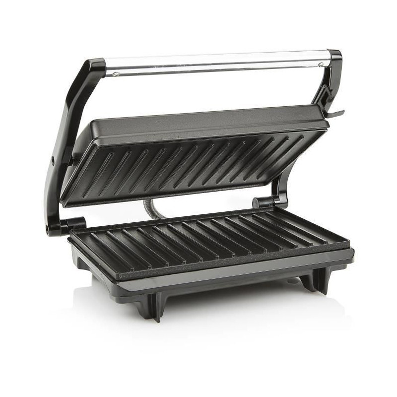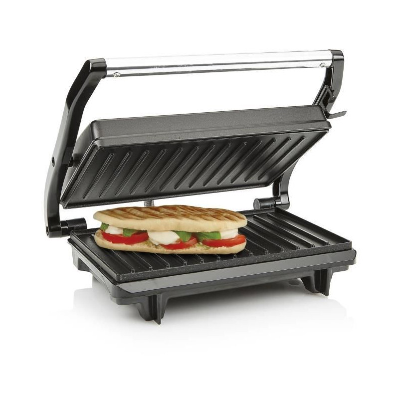 Grill a contact 700W - Plaques a griller - Revetement anti-adhérent - Surface de cuisson 22,5 x 14 cm - Témoin lumineux de fonctionnement - Entretien facile - Poignée intégrée - Couvercle ajustable avec verrou - Pieds anti-dérapants - Rangement du cordon