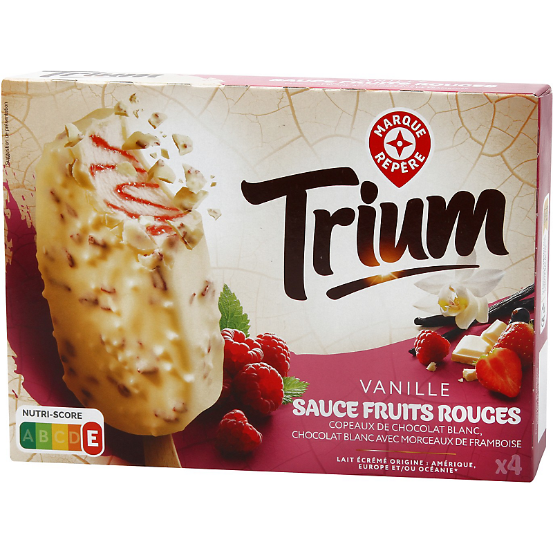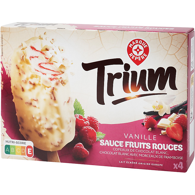 Bâtonnets composés d'une glace à la vanille avec des copeaux de chocolat blanc et un marbrage de sauce aux fruits rouges et d'un enrobage au chocolat blanc avec des pépites de framboises déshydratées sucrées et des billes de riz soufflé TRIUM