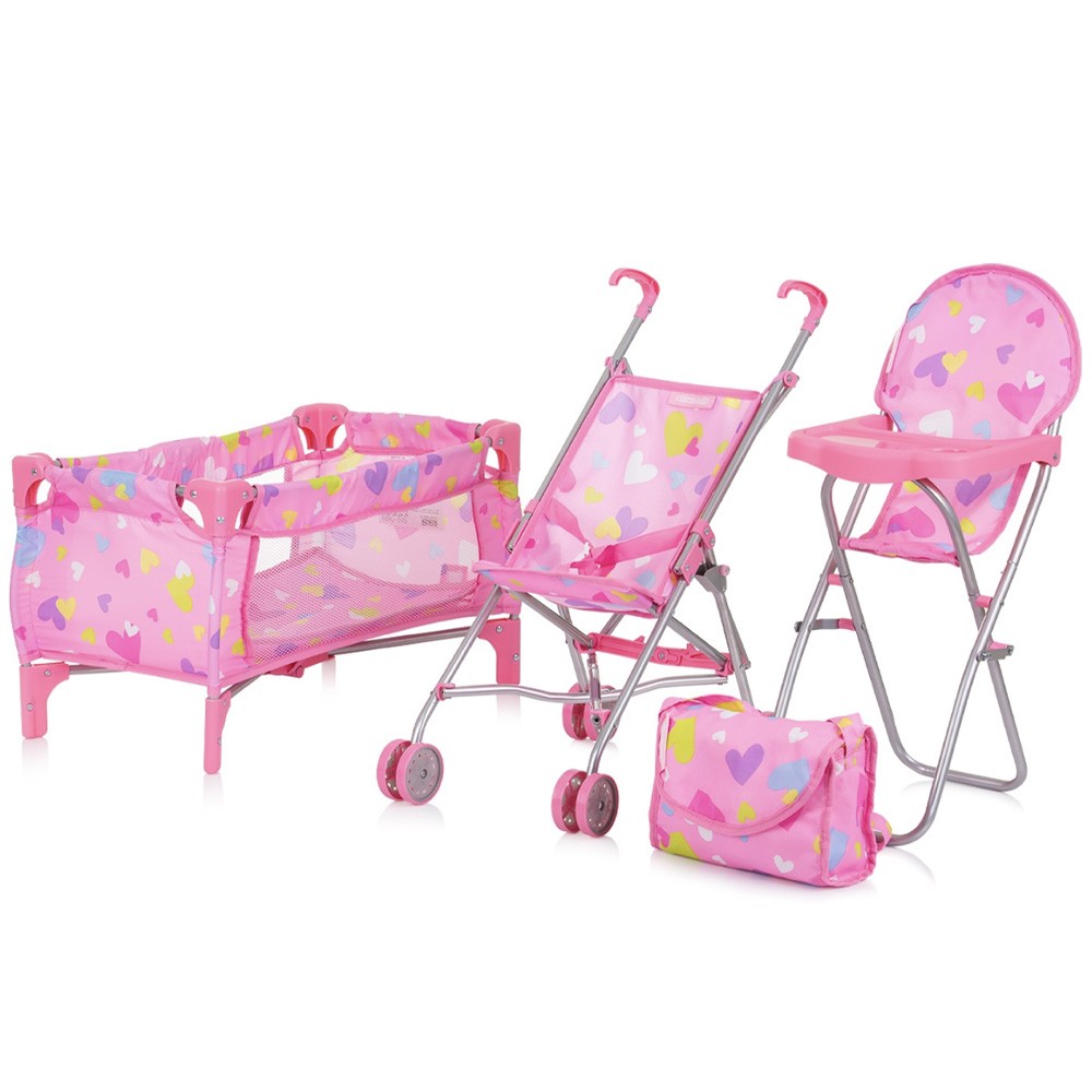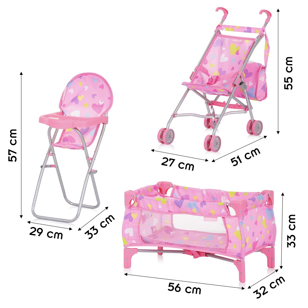 | Libellé | TRIXY Ensemble 3en1 pour poupée Poussette pliable avec sac à langer Chaise haute Lit parapluie jouet enfant 3-6 ans Coeurs |