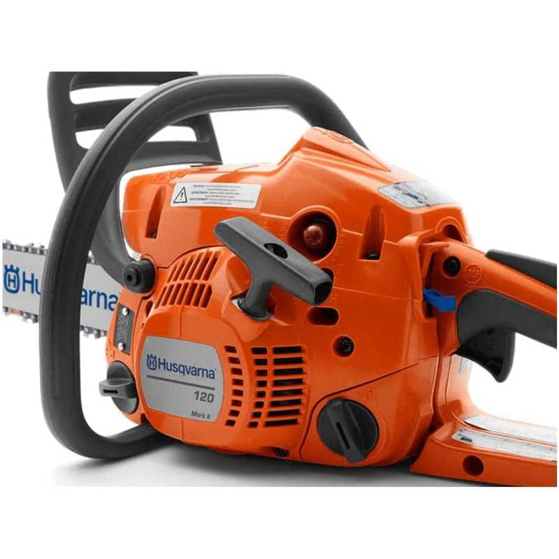 Tronçonneuse thermique mark II 120 Husqvarna Cylindrée 38.2 CM3 Vitesse de chaîne maximale 16.8 m/s Doté de la technologie de moteur X-Torq Faible émission grâce au système Air Injection pour conserver le filtre propre Faible rebond Longueur du guide 35 cm Très maniable dû a son faible poids de 4.85 kgTronçonneuse thermique simple d'utilisation La tronçonneuse thermique Mark II 120 est la petite soeur de la tronçonneuse husqvarna 135 mark II : puissance et précision pour des performances optimales. Découvrez une tronçonneuse professionnelle de haute qualité, conçue pour répondre aux exigences les plus strictes des utilisateurs avertis. Avec son moteur thermique de pointe, la Mark II 120 offre une puissance exceptionnelle pour une coupe rapide et efficace. Une fiabilité remarquable La fiabilité est au cœur de la conception de cette tronçonneuse, assurant des performances constantes même dans les conditions les plus exigeantes. Son design ergonomique garantit une prise en main confortable, réduisant la fatigue lors d'une utilisation prolongée. Que ce soit pour des tâches de coupe légères ou des travaux plus exigeants en extérieur, la Mark II 120 est l'outil idéal pour accomplir vos projets avec aisance. L'outil nécessaire pour vos travaux forestiers Dotée d'un guide de 35 CM ainsi que d'une chaîne de qualité cette tronçonneuse vous offre une précision inégalée dans chaque coupe. Vous pouvez compter sur la Mark II 120 pour des coupes nettes et précises, que ce soit pour l'abattage d'arbres, la découpe de bois de chauffage ou d'autres travaux forestiers. Une tronçonneuse thermique à faible émission de gaz Cette tronçonneuse thermique est également conçue avec une attention particulière à l'efficacité énergétique et au respect de l'environnement. Son moteur à faible émission de gaz nocifs contribue à préserver la nature tout en maintenant des performances optimales. Fiable, performante et respectueuse de l'environnement, la tronçonneuse thermique Mark II 120 est le