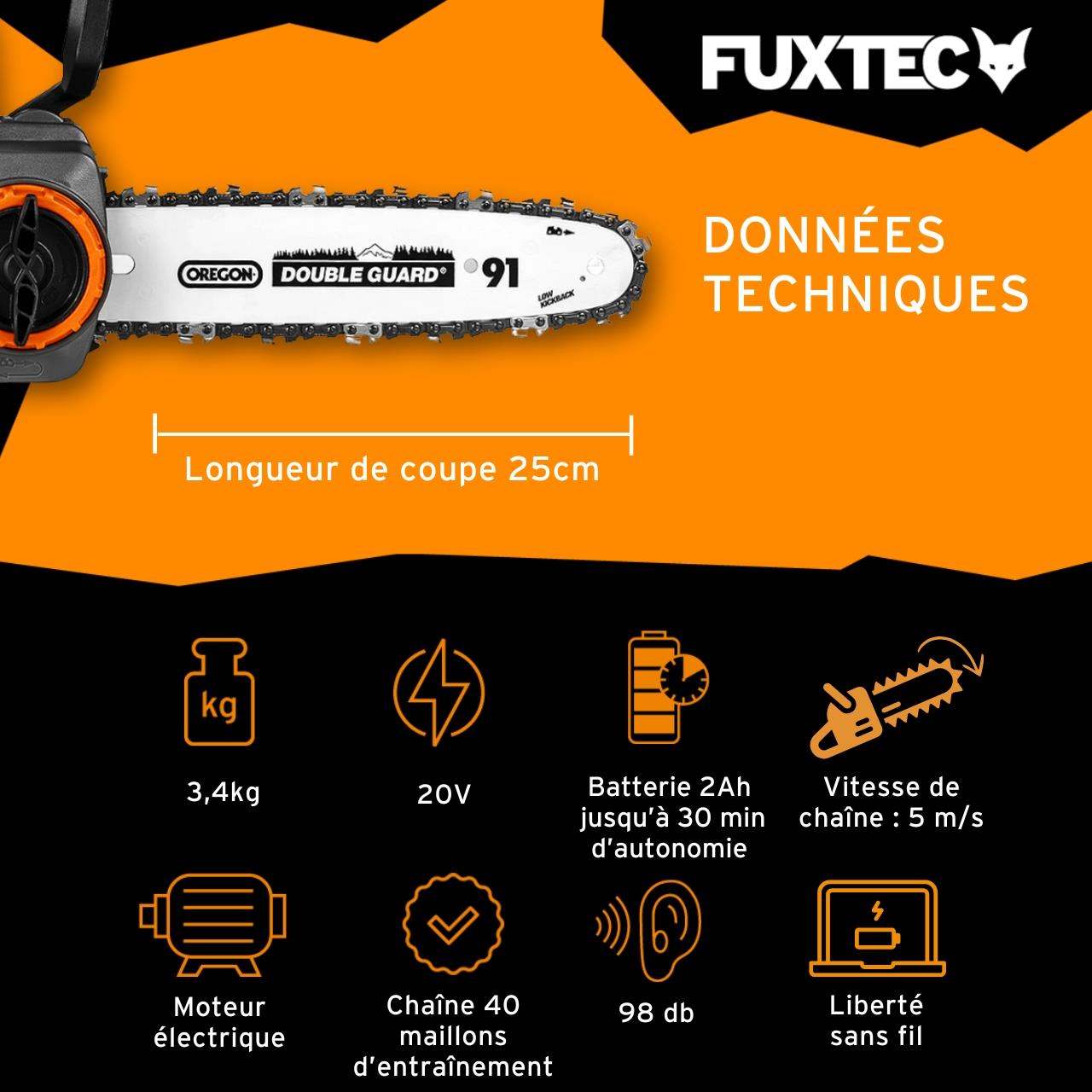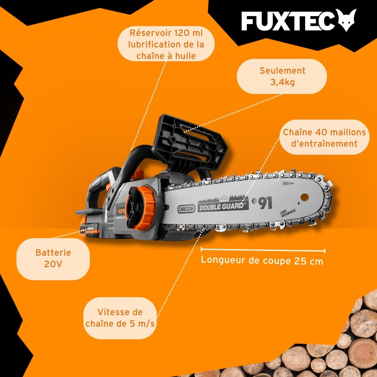 Tronçonneuse batterie - FUXTEC FX-E1KS20 - 20V Guide 10 pouces - Set batterie 2Ah et chargeur 2,4A