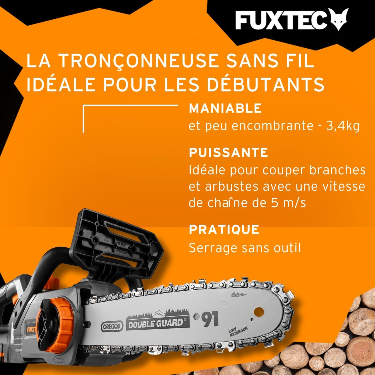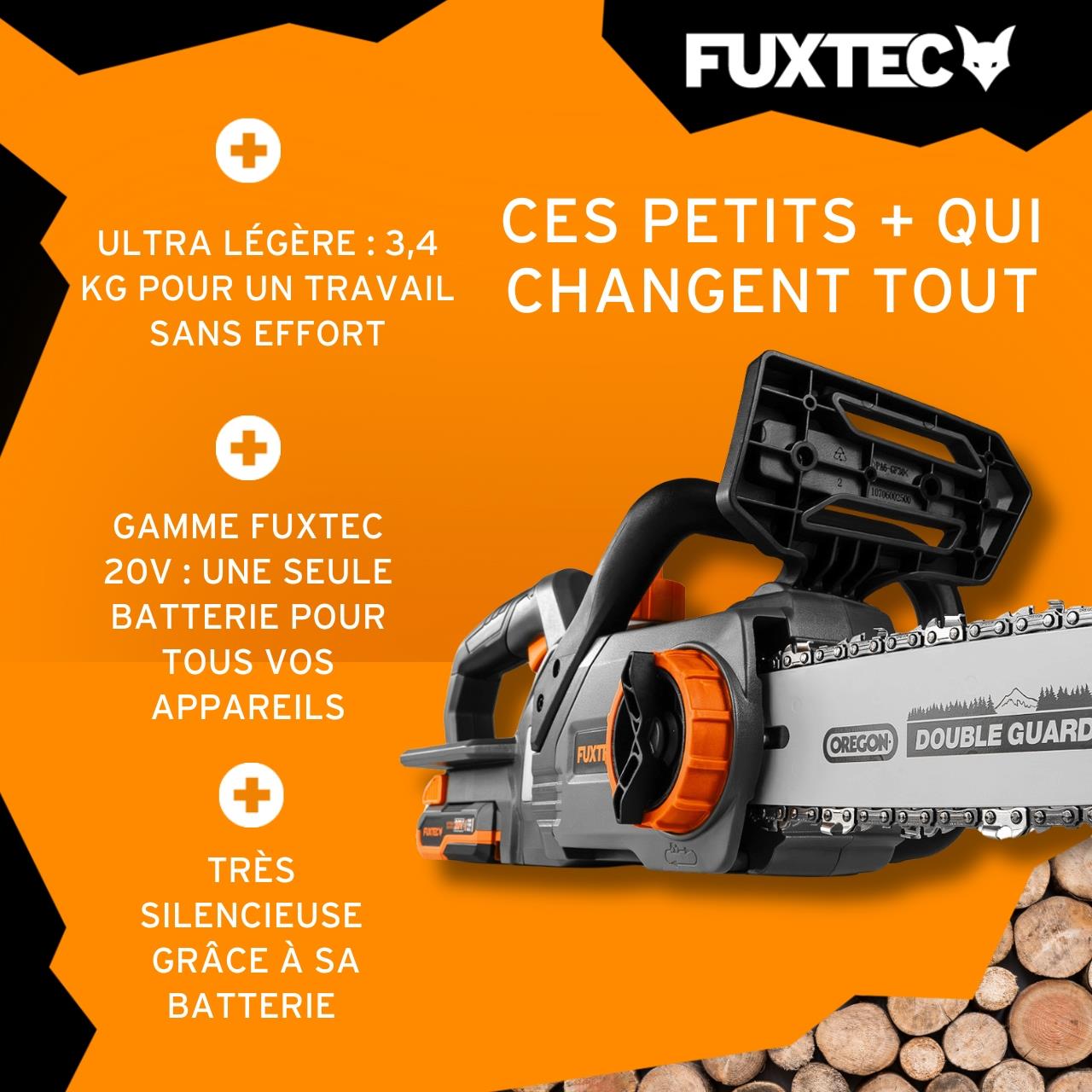 Tronçonneuse à batterie 20 V FX-E1KS20 set batterie 2Ah et chargeur 2,4A. Super légère, super silencieuse. Entrée de gamme parfaite pour les outils à batterie FUXTEC !
