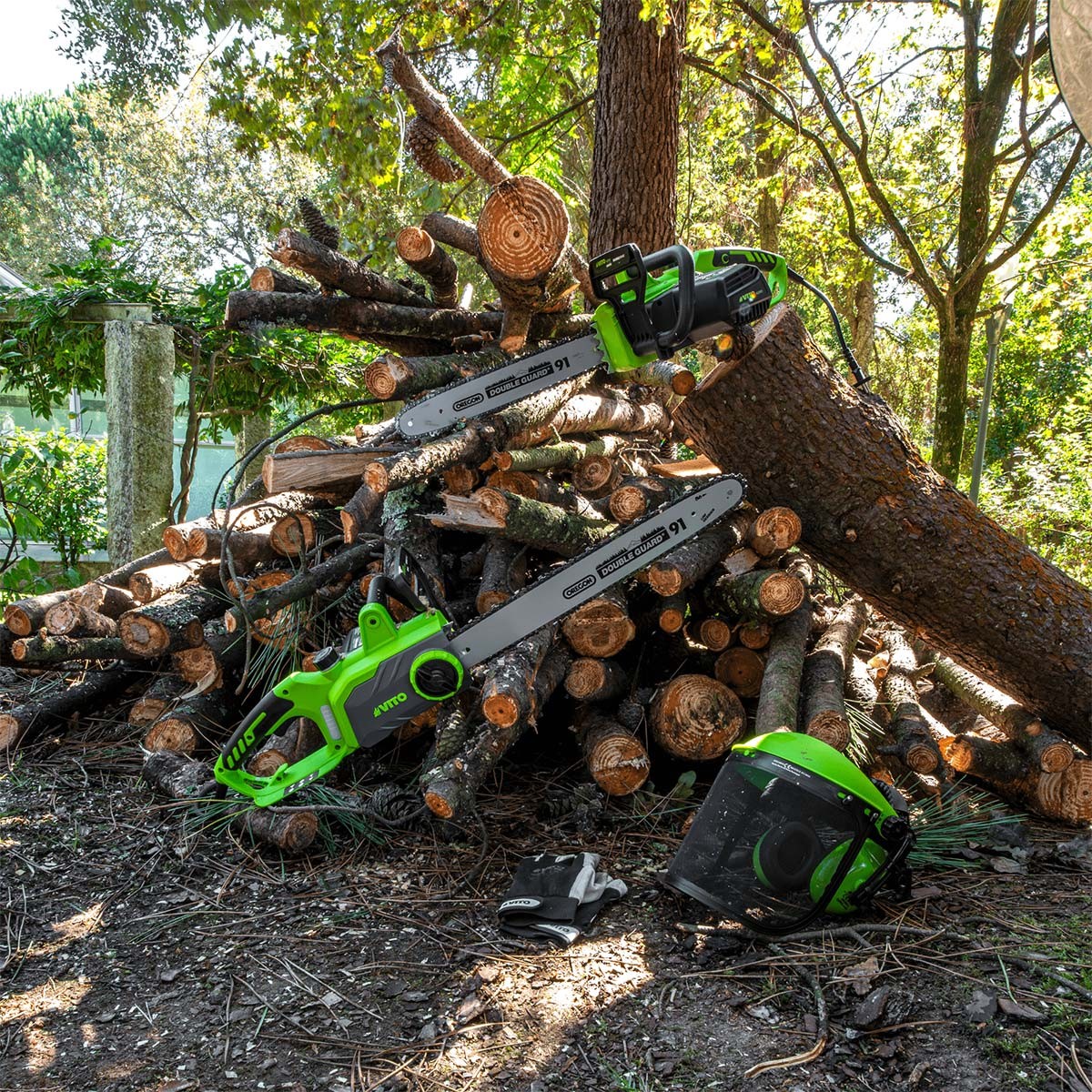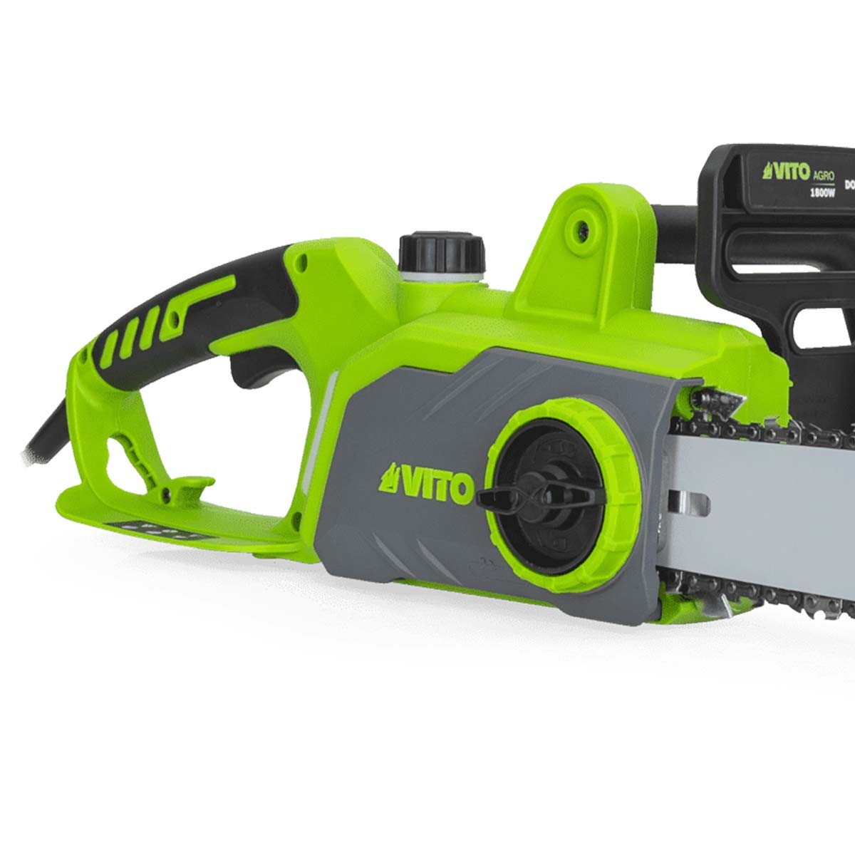 La tronçonneuse électrique VIE1800A de VITO délivre une puissance de 1800W pour une vitesse de rotation de 13.5 m/s. GUIDE OREGON. Elle possède une lame de 405 mm de longueur, dotée de 57 maillons avec un pas de 3/8".