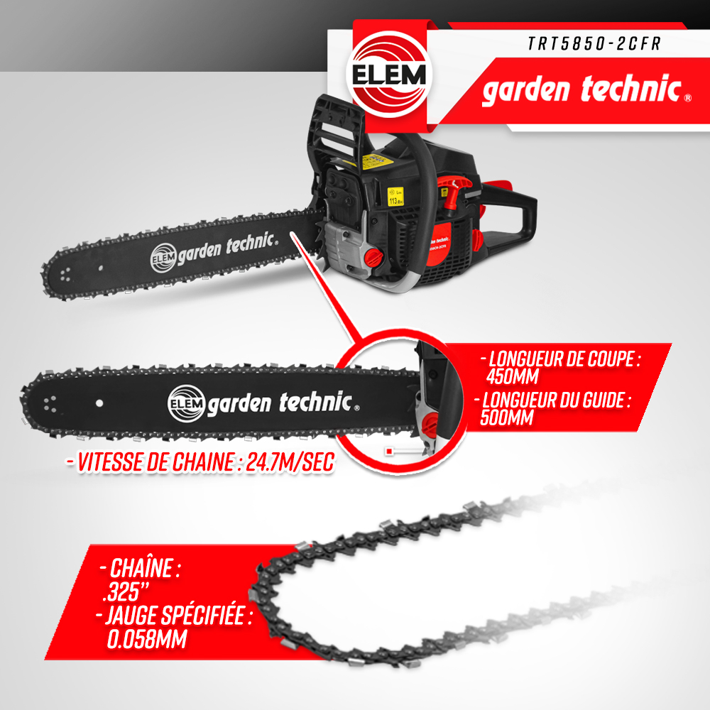 | Libellé | Tronçonneuse thermique 58cc - TRT5850CH-2CFR - Elem Garden |