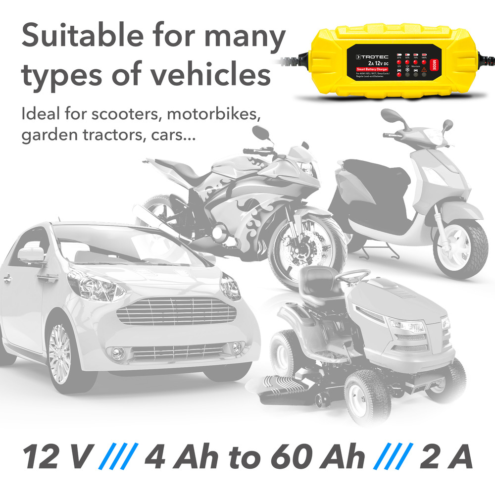 - Idéal pour les véhicules à batterie de 12 V, par ex. voitures, motos, scooters, tondeuses à gazon mobiles