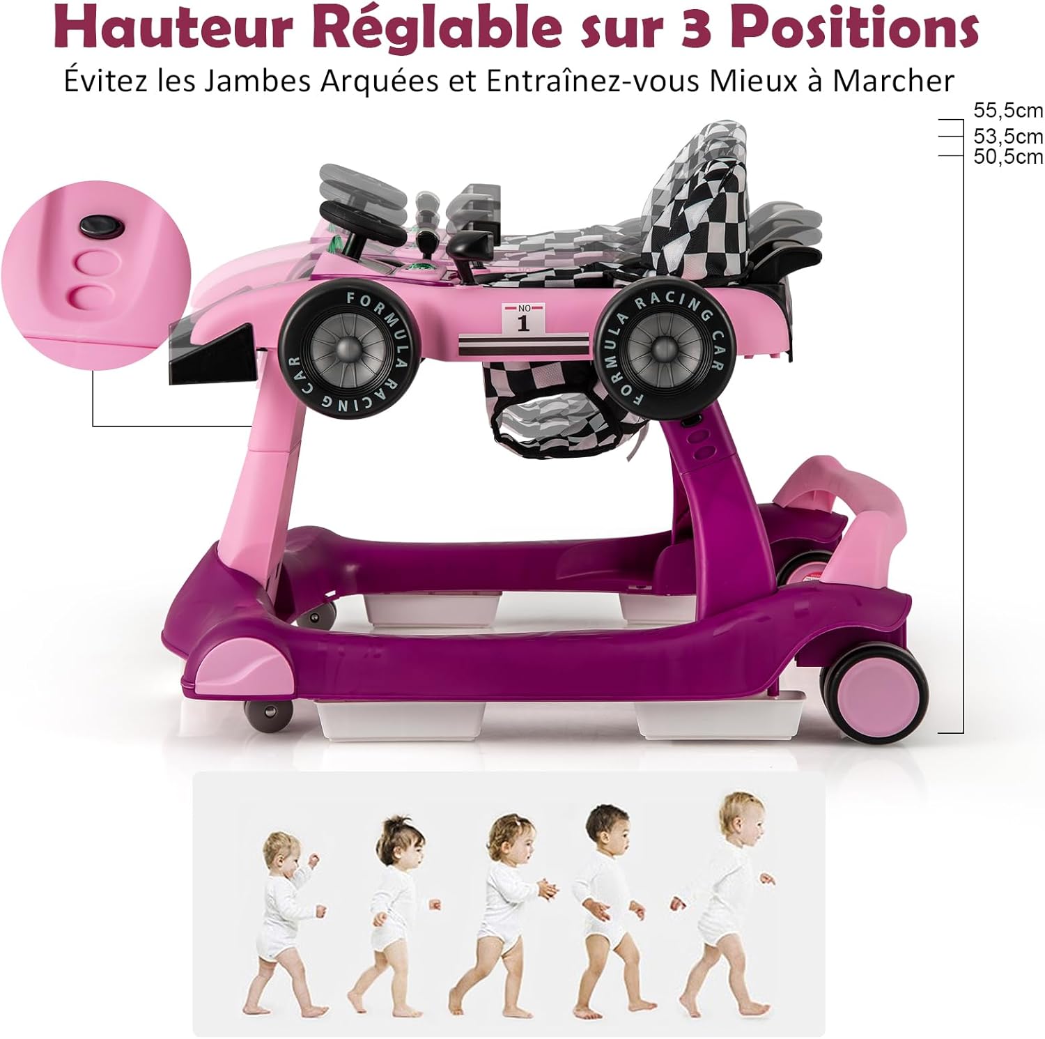 - Hauteur réglable & Design Pliable : La hauteur du trotteur marche bebe peut être réglée sur 3 positions (50,5-53,5 cm) par bouton-poussoir (hauteur du fond du coussin par rapport au sol : 20/22/24 cm). En plus, le trotteur pliable est facile à ranger et économise de l'espace.