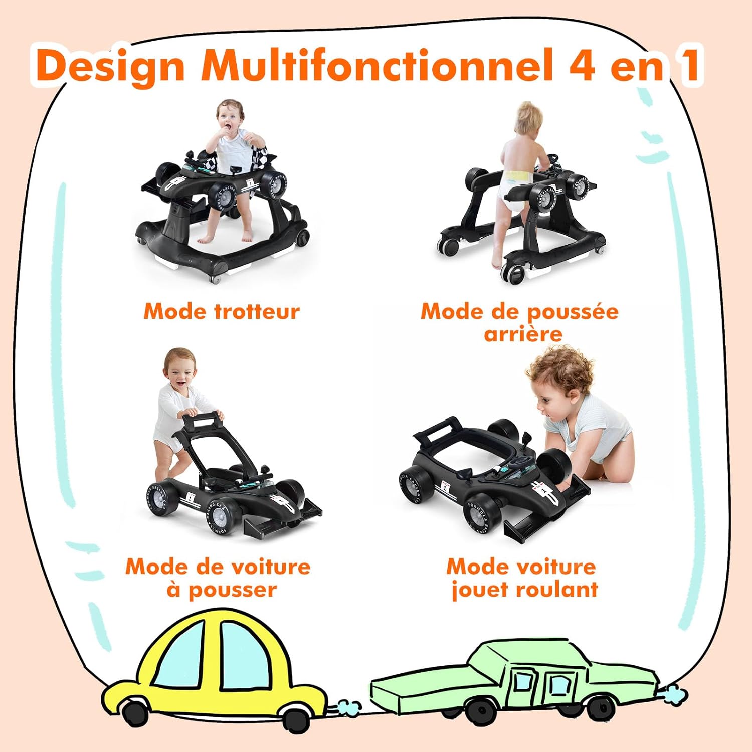 • Trotteur bébé 4 en 1 : En plus d'être utilisé comme un trotteur, votre bébé peut également l'utiliser comme une poussette, une poussette arrière et un jouet de voiture pour répondre aux différents besoins de bébé 6-18 mois lorsqu'il apprend à marcher ou s’amuser.