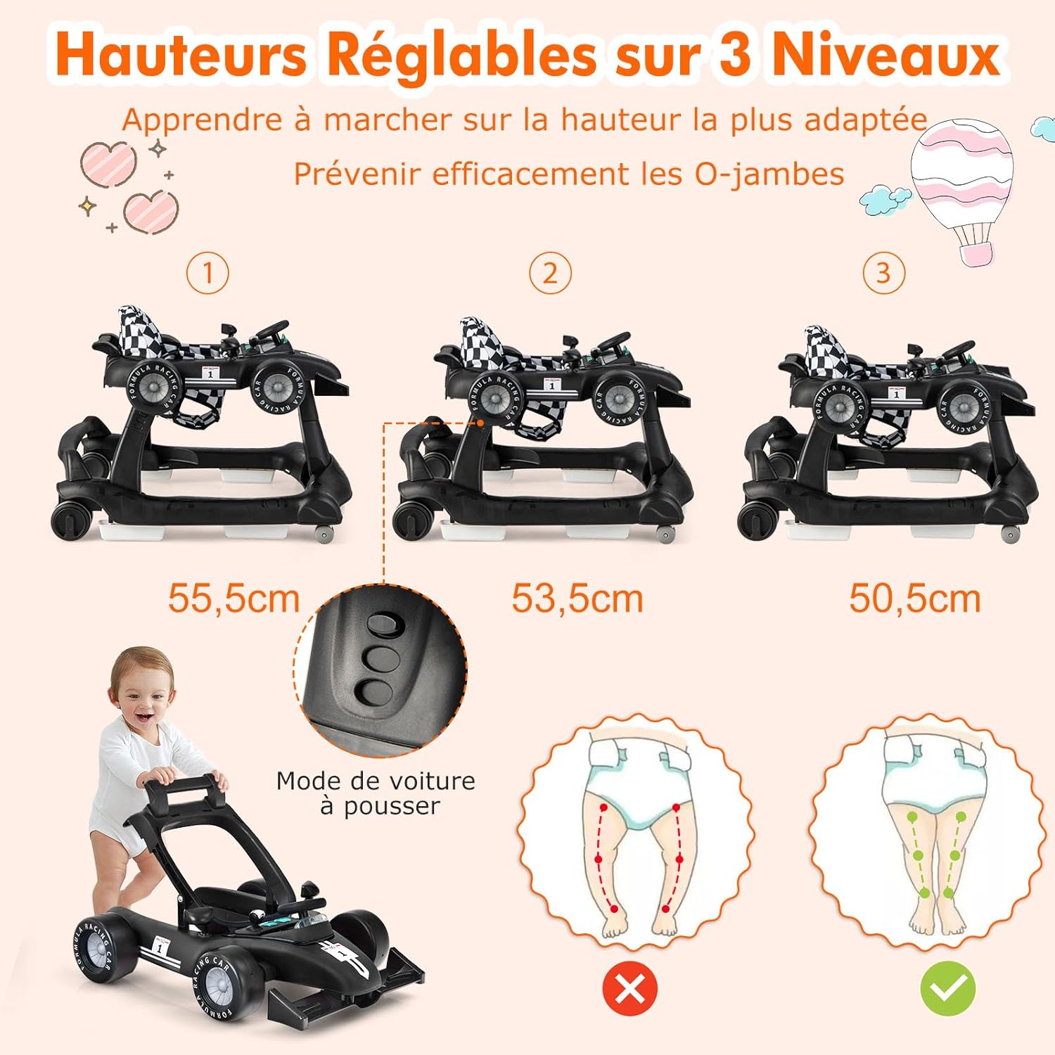 • Hauteur réglable & Design Pliable : La hauteur du trotteur marche bebe peut être réglée sur 3 positions (50,5-53,5 cm) par bouton-poussoir (hauteur du fond du coussin par rapport au sol : 20/22/24 cm). En plus, le trotteur pliable est facile à ranger et économise de l'espace.