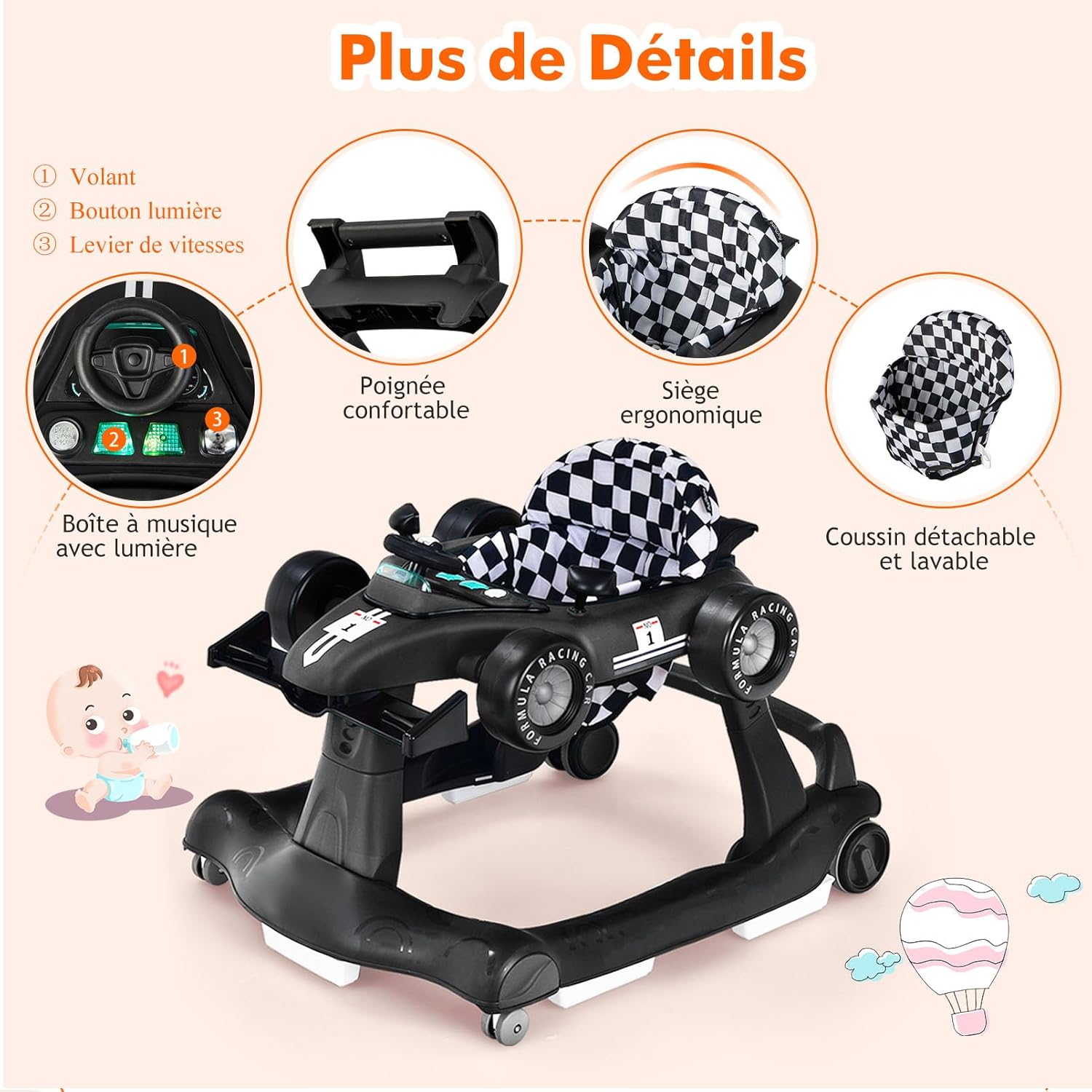 • Apparence cool & Panneau Musical : Avec une apparence de voiture de formule et le panneau de musique et lumière, notre youpala trotteur est attrayant et intéressant pour les enfants. Une fois la boîte à musique démontée, le trotteur peut être utilisé comme chaise de salle à manger.