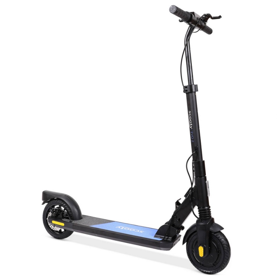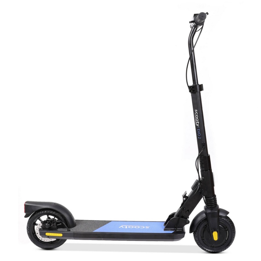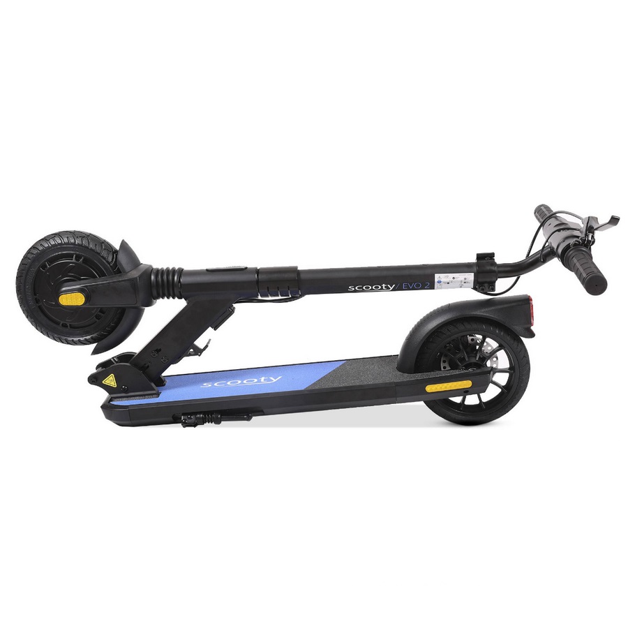 EVO2 - trottinette électrique 250w 25km/h noir/bleu - La trottinette électrique Scooty EVO2 associe polyvalence et style. Idéale pour les trajets en ville et en transport en commun, les usagers habitants en étages. La citadine légère et simple pour tous les jours !  Pour la sécurité, la trottinette EVO 2 est équipée d'un triple système de freinage : frein à disque combiné au frein électronique et au pied arrière). Son moteur puissant de 250W nominal peut atteindre jusqu'à 350W en puissance instantanée. Son châssis se trouve renforcé et supporte un poids de 120Kg. La trottinette EVO 2 avec son guidon réglable en hauteur et ses grandes roues de 8'' apportera confort et stabilité au quotidien. Son écran central informe l'utilisateur de sa vitesse et de son autonomie restante. - Type de produit : Trottinette électrique.