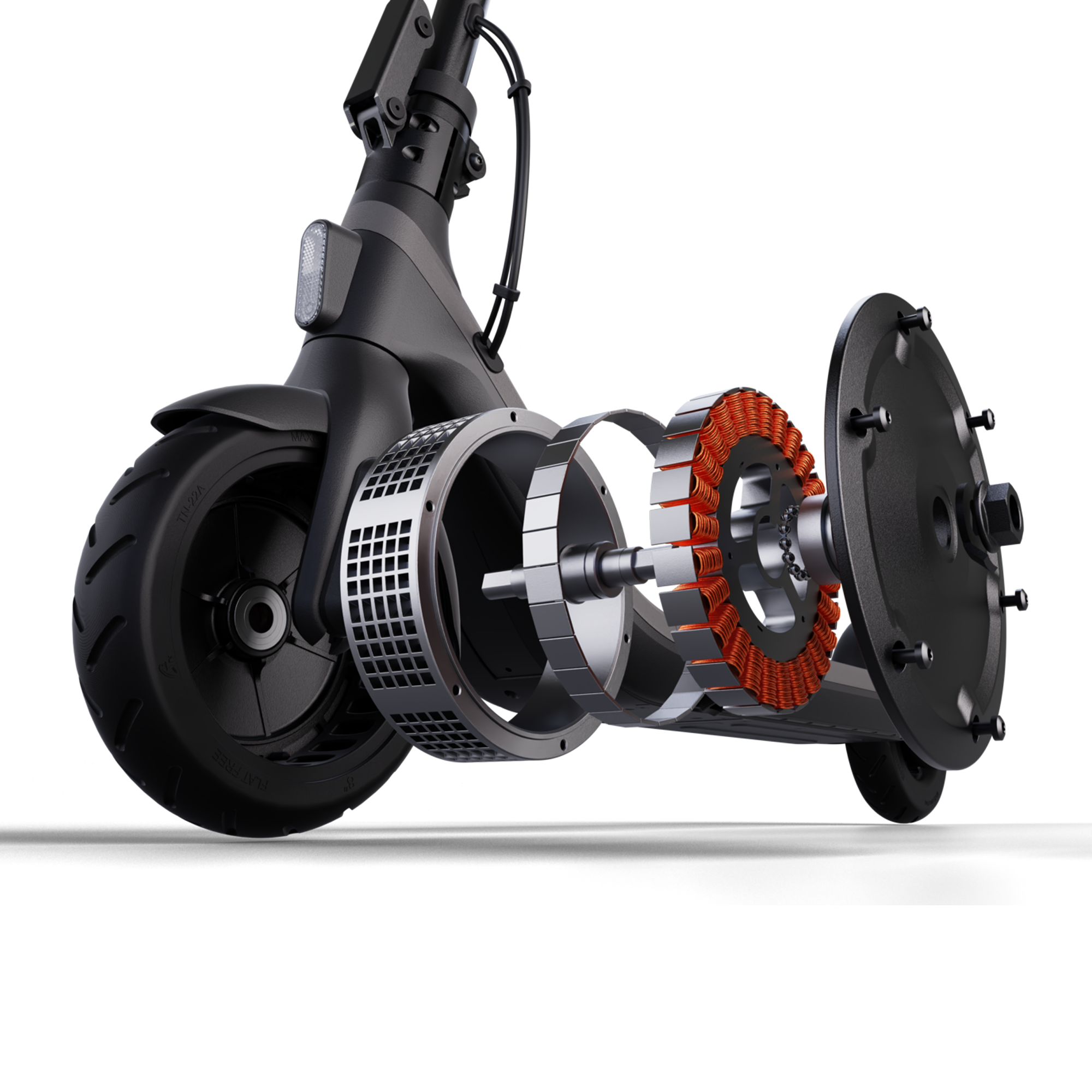 - Pneus alvéolés de 8,1 pouces, increvables et sans entretien