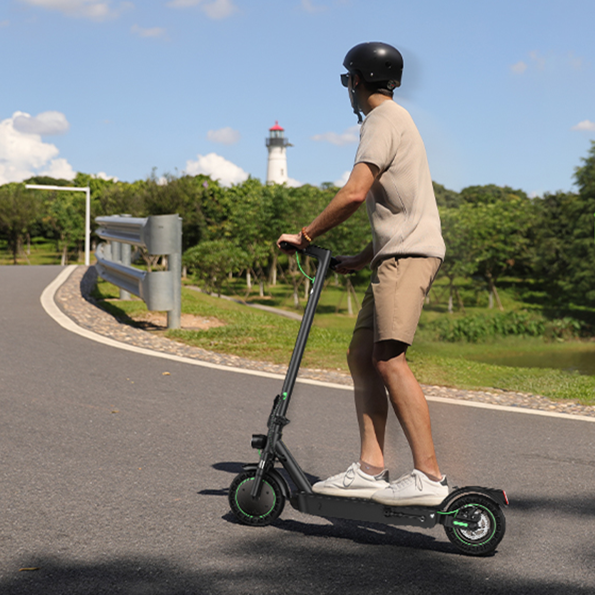 Équipé de pneus pleins en nid d'abeille de 10 pouces et de doubles amortisseurs (avant et arrière), le scooter offre une excellente absorption des chocs, assurant une conduite douce et confortable même sur des terrains accidentés ou des dos d'âne.