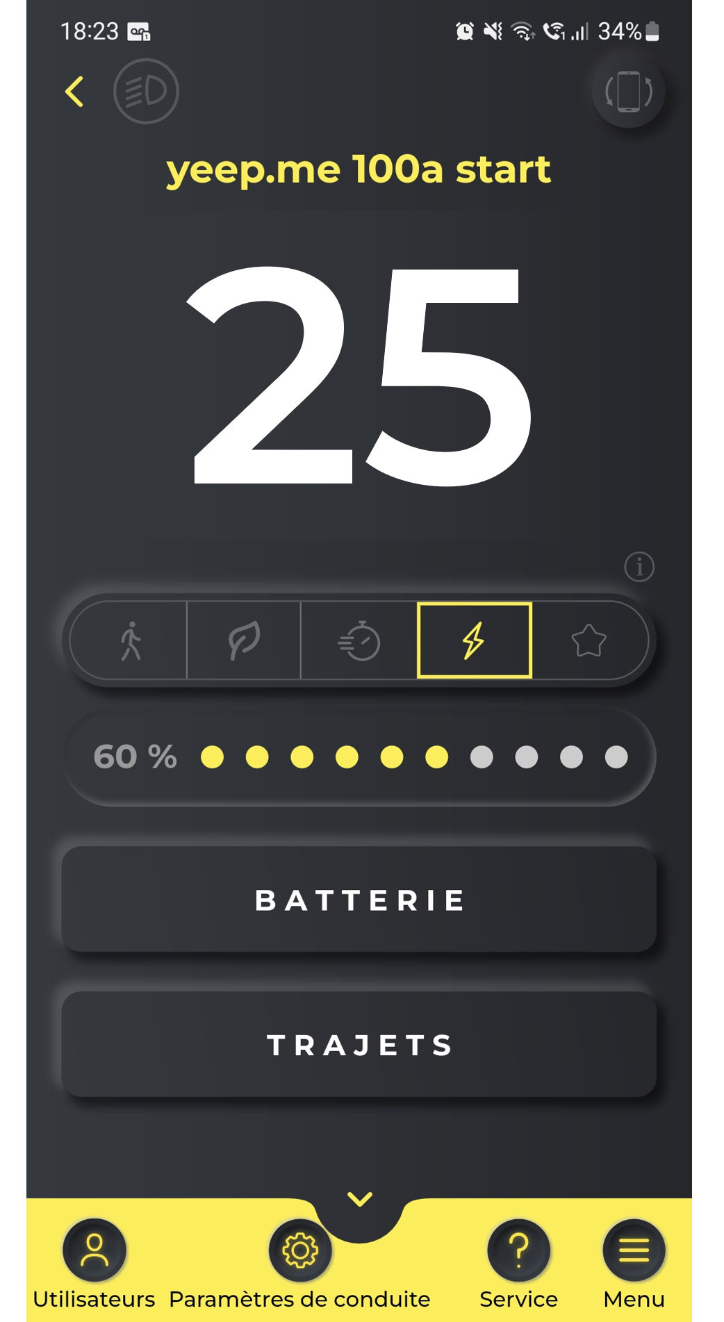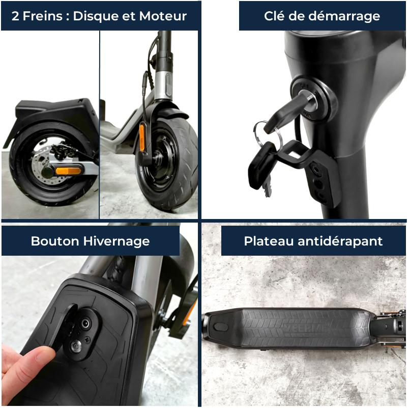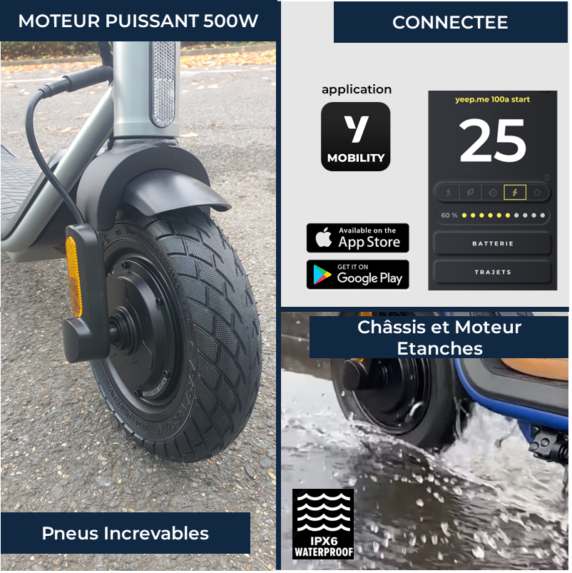 **Trottinette Puissante, Robuste et Polyvalente** + **Puissante** : 500W 36 Volts + **Sûre** : double frein, tapis antidérapant + **Robuste** : Châssis renforcé tubulaire en acier. Compartiment batterie et moteur étanches : Etanchéité IPX6. Bouton hivernage de protection de la batterie. + **Sécurisée** : démarrage par clé et application + **Connectée** : appli yeep.me **Caractéristiques** : - Roues de 10'' avec pneus increvables (avec intérieur alvéolé) - Moteur 36V de 500W max - Batterie 7.8Ah 36V longue durée garantie 15.000km - Autonomie jusqu'à 30km - Freins : combinés disque arrière + électronique avant - Tapis en gomme anti-dérapant - Démarrage par clé - Feu Avant et Arrière à LED avec commande au guidon, feu de stop. Réflecteurs. - Tableau de bord digital avec indication de l'heure, de la vitesse, distance parcourue et des modes de conduite. 5 modes dont 1 mode individual paramétrable avec l’application yeep.me - Bluetooth avec application : gestion des paramètres, trajets,… et mise à jour de la trottinette - Charge maxi : 120kg - Poids net : 19kg - Dimensions : L 115 x H 123 x l 54 cm (produit ouvert), L 118 x H 47,5 x l 18,5 cm (produit plié) *Commentaire Garantie : Produit DIRECT Fabricant : CIBOX, propriétaire de la marque YEEP.ME Garantie standard 2 ans : SAV Europe (France, Belgique,...) avec support technique, centre de réparation, ainsi qu’un réseau de réparateurs de proximité. Garantie étendue à 5 ans offerte : après enregistrement dans les 2 mois suivant l'achat du produit sur le site **support.yeep.me** Après enregistrement : garantie totale de 5 ans (batterie dans la limite de 15.000 km sur la version 100a start). **Présentation Générale** La YEEP.ME 100a start fait partie de la gamme série A qui a pour vocation de proposer des produits offrant un excellent rapport Qualité – Performance / Prix pour une mobilité au DURABLE avec une **GARANTIE de 5 ANS**. **DURABILITE** Les trottinettes de la gamme Série A bénéficient d’un **châssis en acier tubulaire résistant et éprouvé**. Elles sont équipées d’une **batterie haute qualité et d’un BMS** les protégeant contre les courts-circuits, surcharges, surintensités, et températures ; leur permettant une** longue durée de vie jusqu’à 1000 cycles**. Le châssis de la YEEP.ME 100a a été conçu pour lui permettre de résister aux infiltrations d’eau lors de vos déplacements sous la pluie. Elle est **certifiée IPX6** et équipée d’un moteur et d’un compartiment batterie étanches. La série A est équipée d’un **bouton « hivernage »** situé à proximité du connecteur de charge permettant de préserver la durée de vie de la batterie lors des périodes de non utilisation. **CONNECTEE et EVOLUTIVE** Elle est équipée d’une connexion Bluetooth et d'une application YEEP.ME Mobility disponible sur iOS et Android. L’application permet : + d’enregistrer la garantie directement de son produit et d'un support client direct en après-vente : + De bénéficier de fonctionnalités élargies. Grâce à la connexion Bluetooth et du contrôleur intelligent YEEP.ME, vous pourrez procéder aux mises à jour par OTA afin profiter des dernières améliorations. **PERFORMANTE et SURE AU QUOTIDIEN** La YEEP.ME 100a délivre de très bonnes performances avec un moteur 36 V de **500W de puissance** pour atteindre 25kmh. Sa **batterie de 7,8Ah 280Wh** vous permettra d’effectuer jusqu’à **30km d’autonomie** (après rodage de 100km). Elle est équipée d’un **double système de freinage** combiné d’un frein à disque arrière et électronique pour un freinage facile à doser et puissant. Dotée de **pneus 10’’ increvables** avec une poche d'air à l'intérieur, elle propose une mobilité avec un minimum d'entretien. Son écran affiche la vitesse instantanée, la distance, le niveau de batterie, le mode d’assistance ainsi que l’heure. Elle possède 5 modes : + « P » : piéton 6kmh + « E » : éco 15kmh et optimisant la consommation d’énergie et atteindre l’autonomie maxi. + « C » : confort 25kmh avec puissance modérée + « S » : sport 25kmh avec toute la puissance du moteur + « I » : individuel, paramétrable avec l’appli YEEP.ME mobility permettant de régler vitesse maxi et la puissance moteur. Elle est équipée d’un système de **démarrage antivol par clés** (2 fournies) et d’un tapis antidérapant en gomme. Son système de pliage, pratique et ingénieux, se clipse dans le garde boue.