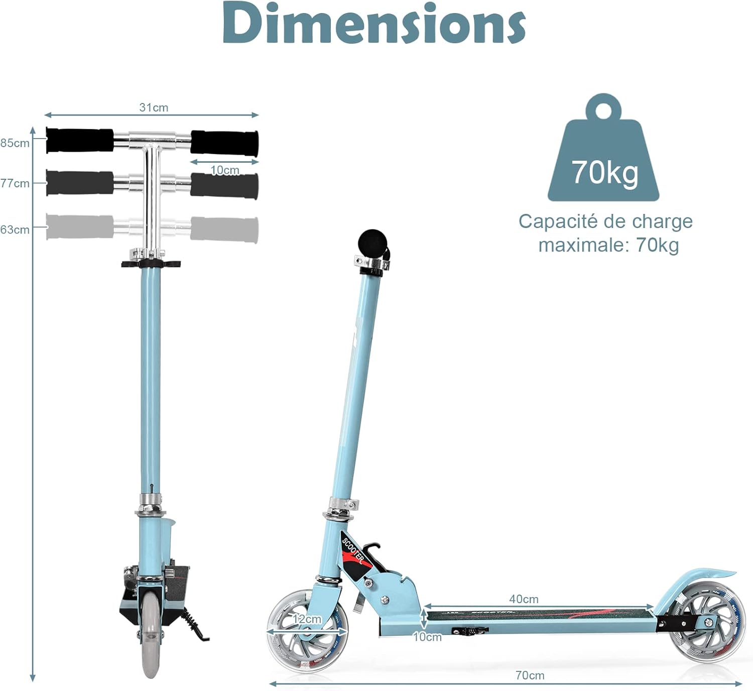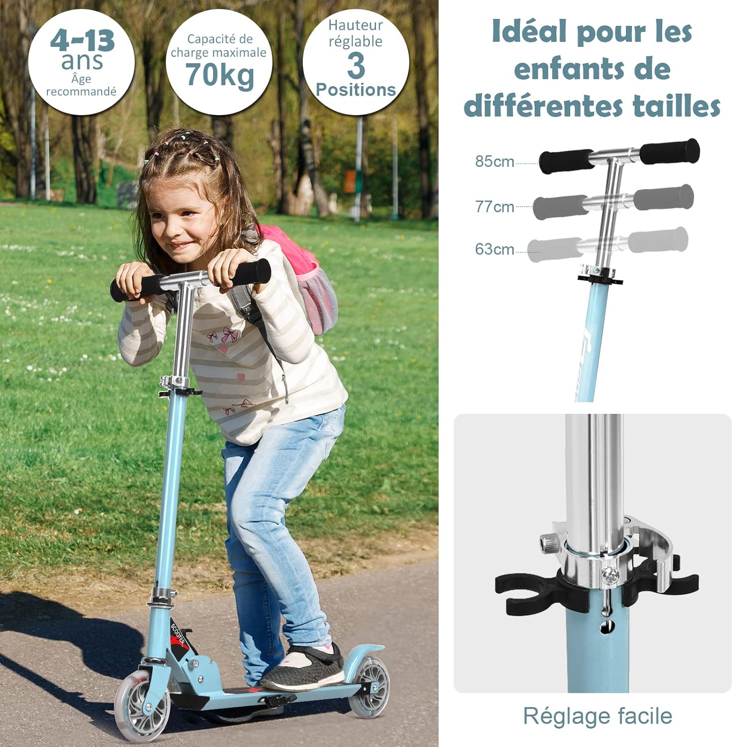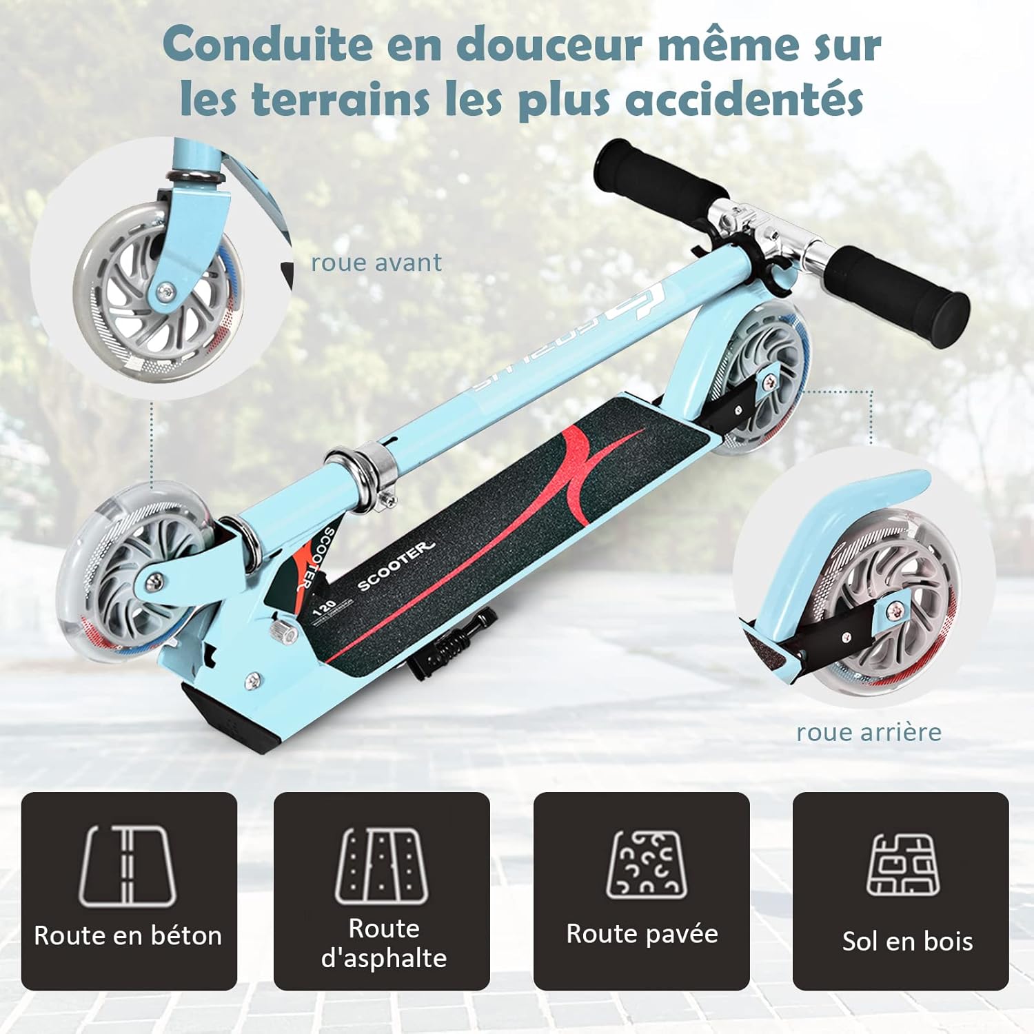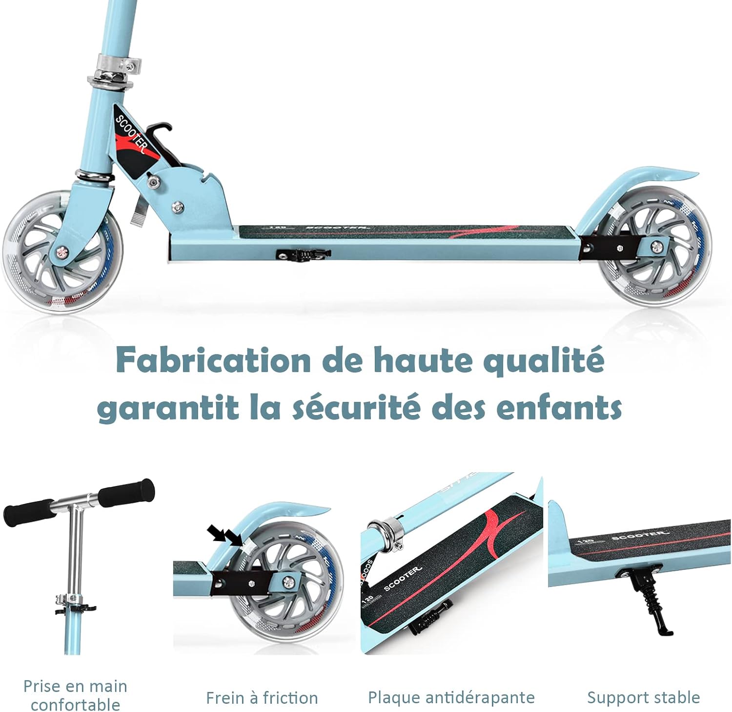 | Libellé | Trottinette enfant 2 roues, patinette enfant pliable, scooter enfant kick avec LED lumière, hauteur réglable (Bleu clair) |