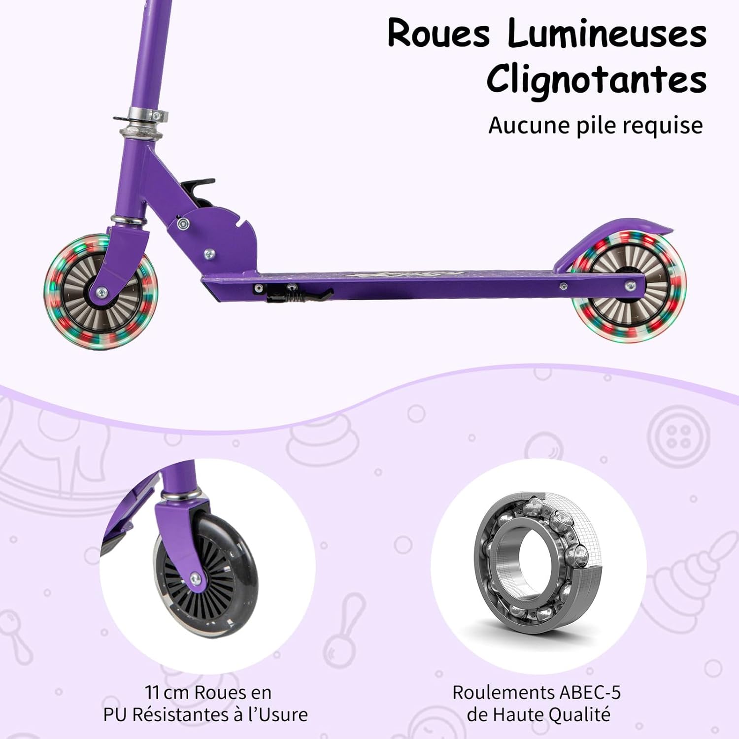 | Libellé | Trottinette enfant pliable avec roues clignotantes, hauteurs réglables, charge 50kg pour 3-8 ans (Violet) |