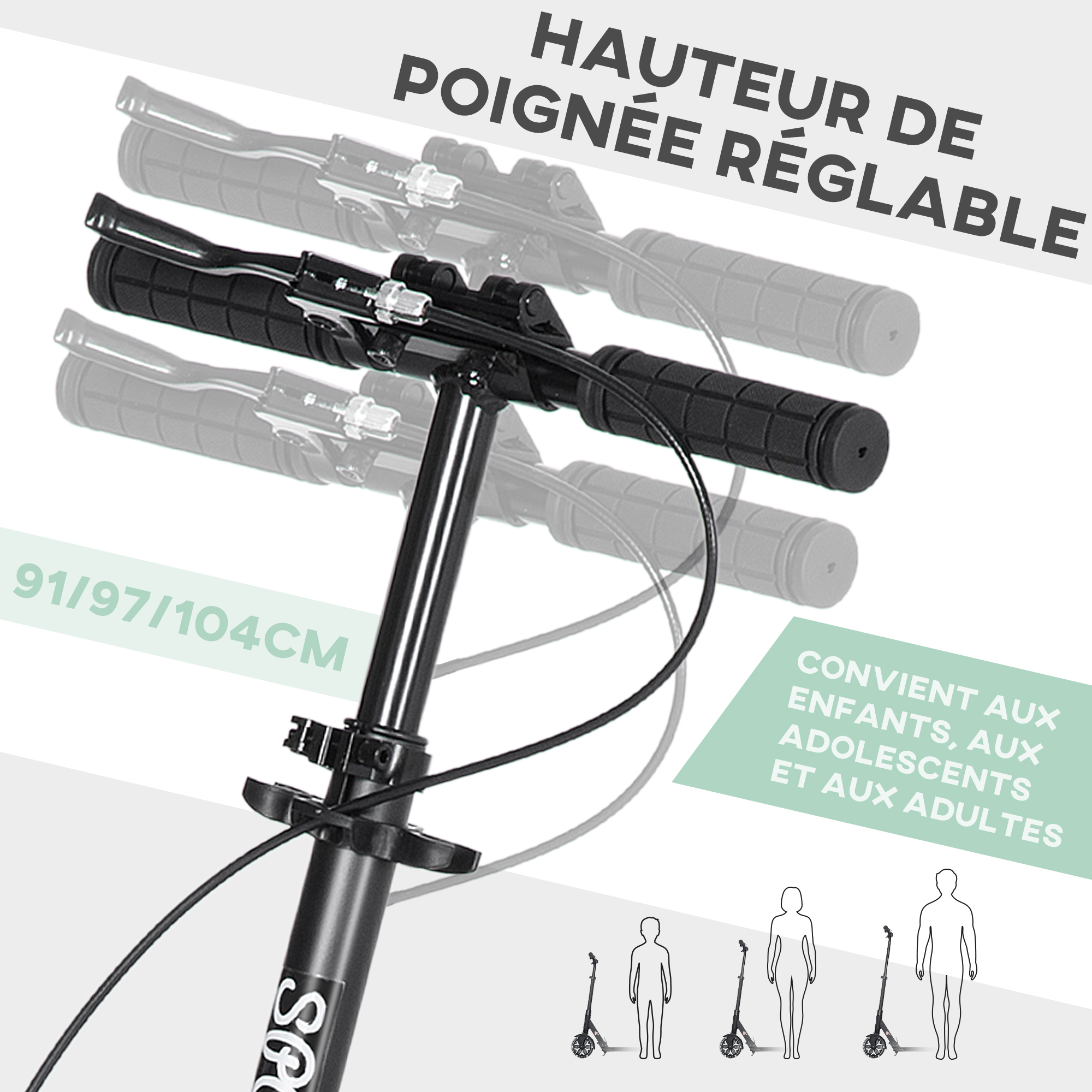 Cette superbe trottinette pliable pour adulte et ado. à partir de 14 ans saura vous ravir ! Dotée d'un châssis mélant alu. et métal avec guidon réglable en hauteur à 3 niveaux (de 91 à 104 cm) et nombreux autres équipements, vous pourrez vous déplacer et vous amuser en toute commodité et sécurité. C'est le cadeau rêvé pour tout amateur de déplacement pratique, écologique.