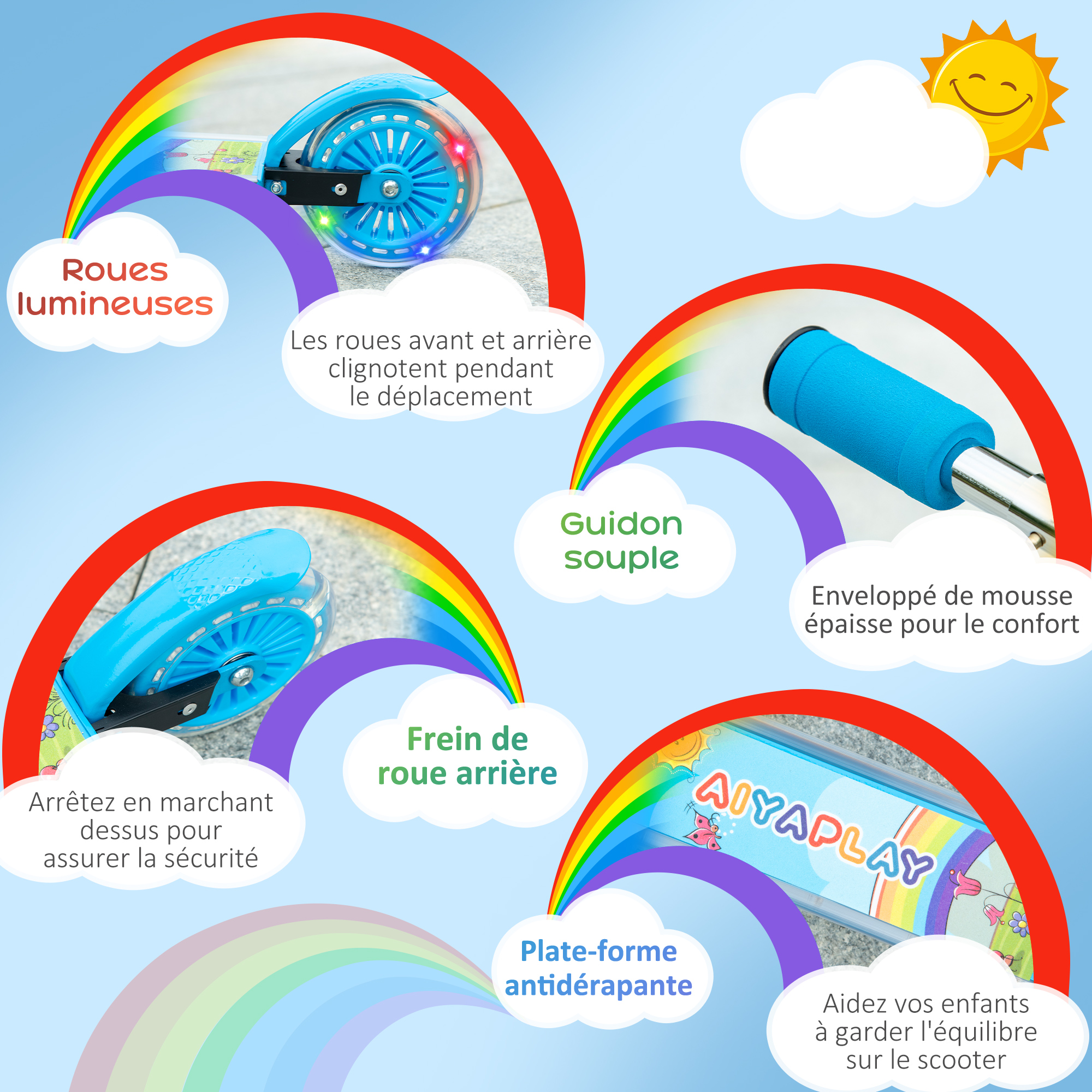 | Libellé | Trottinette pliable enfant à partir de 3 ans roues repose-pied LED frein à friction arrière hauteur guidon réglable 4 niv. métal bleu |