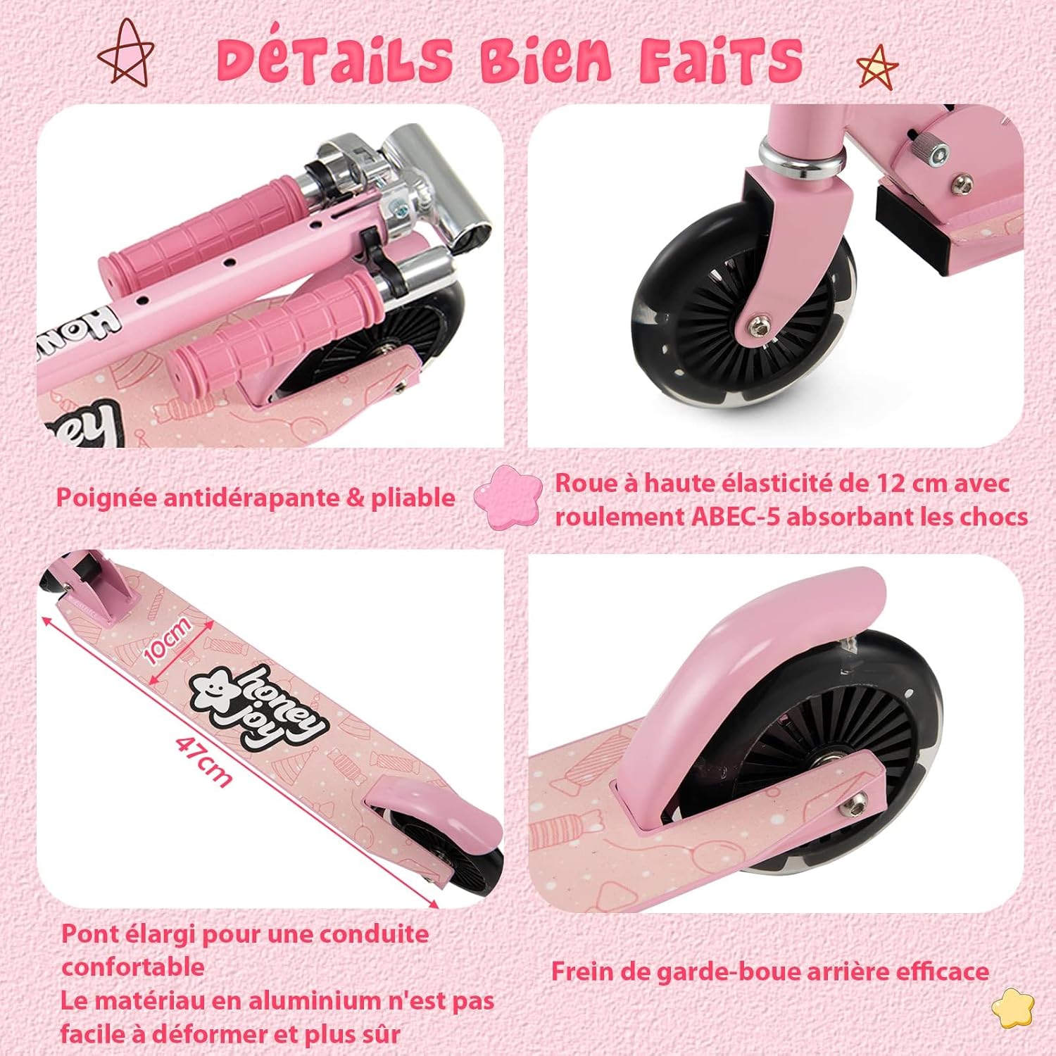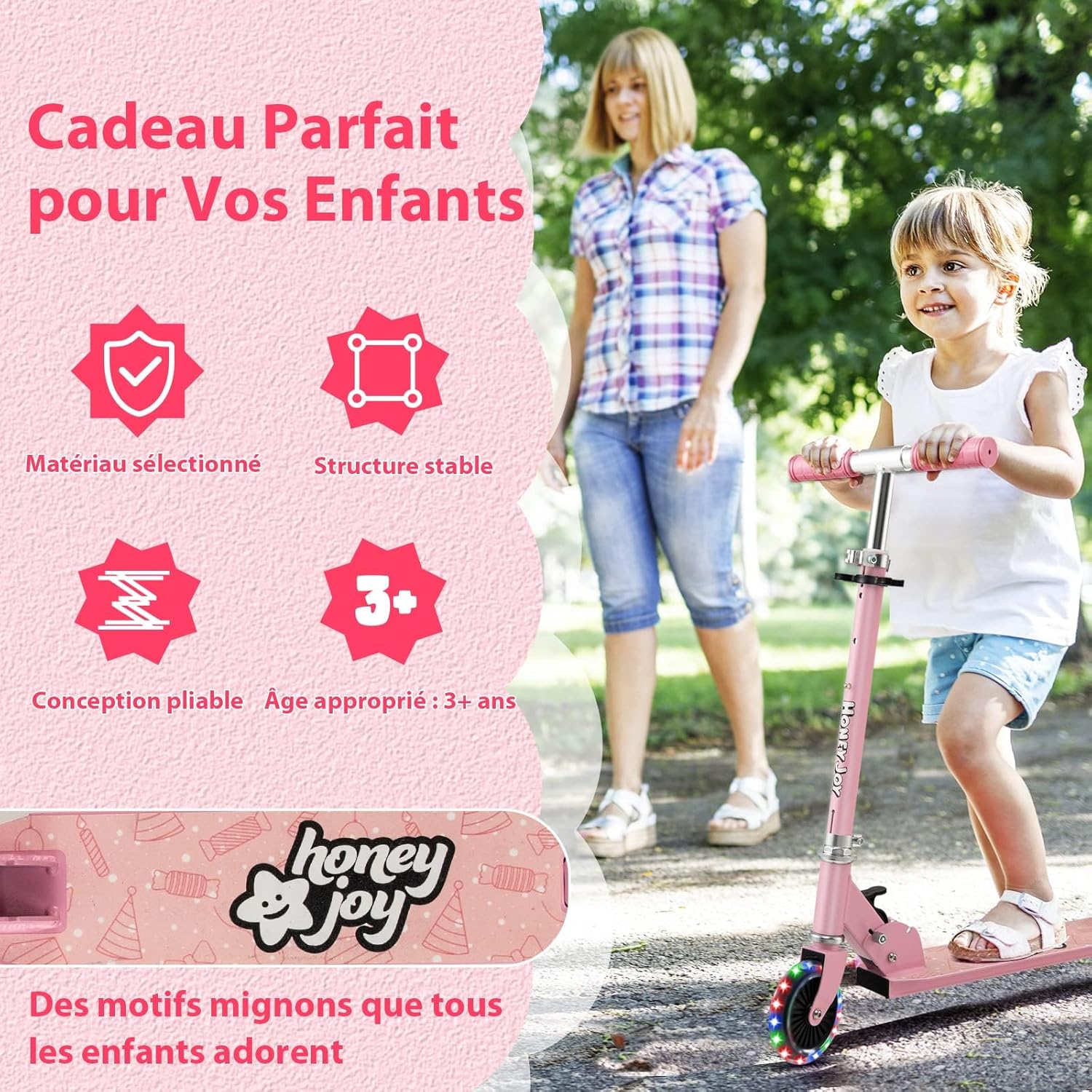 | Libellé | Trottinette pliable pour enfant 3 ans+, roulements ABEC-5, hauteurs réglables, charge 50kg (Rose) |