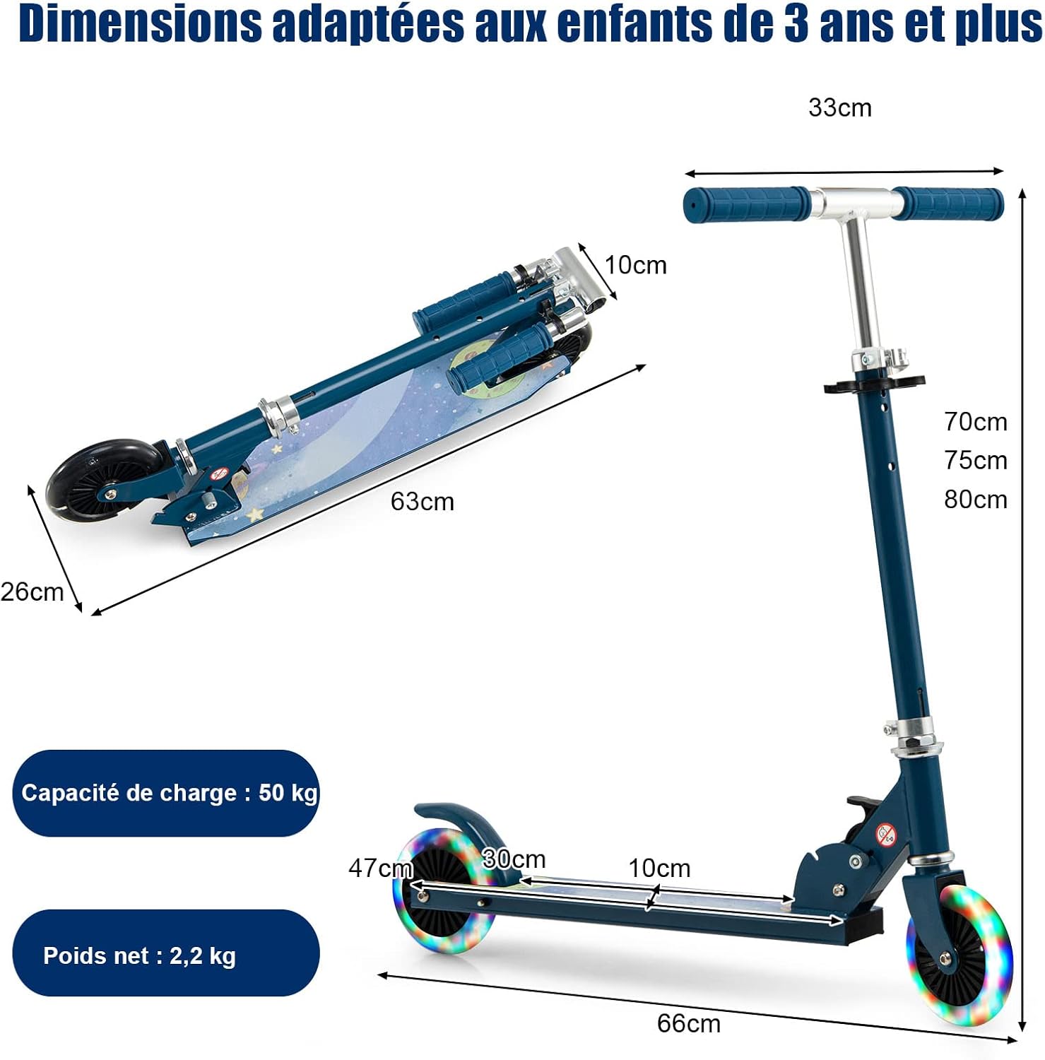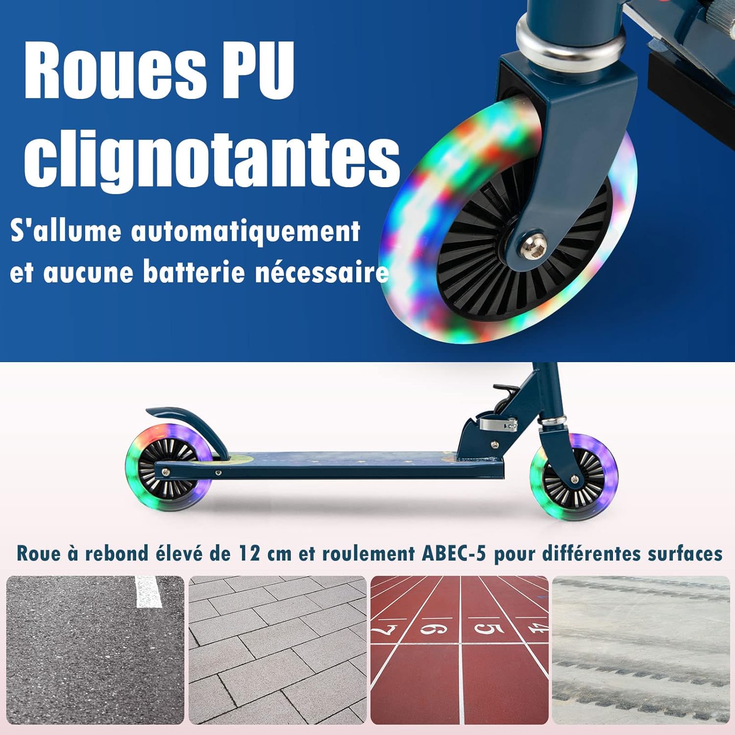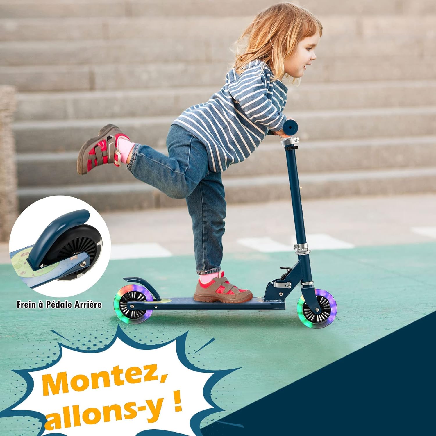 Trottinette pour enfants pliable avec 2 roues lumineuses, guidon réglable alu 3 hauteurs,bleu