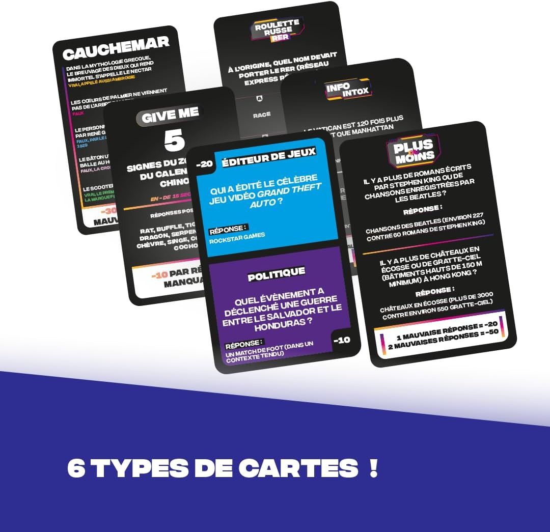 Trou Noir est un jeu de culture générale fun et insolite à jouer en solo ou en équipe avec ses proches dans lequel les joueurs vont s’affronter pour révéler le ou les plus inculte(s) du groupe. Vous perdez des points et descendez sur le plateau si vous n'arrivez pas à répondre à la question posée !