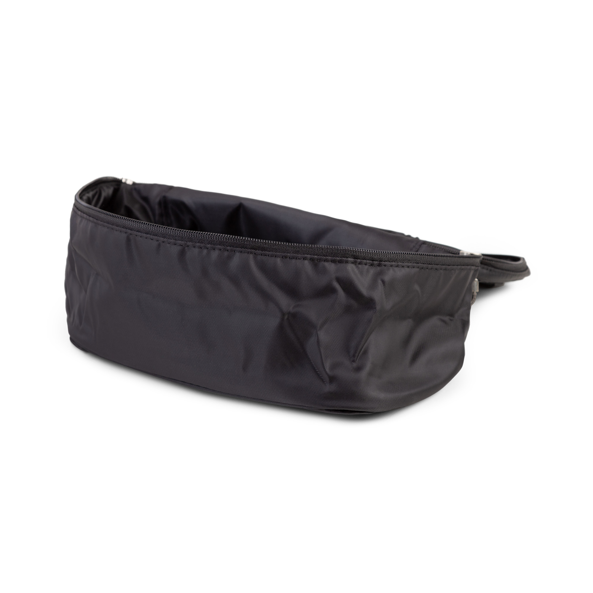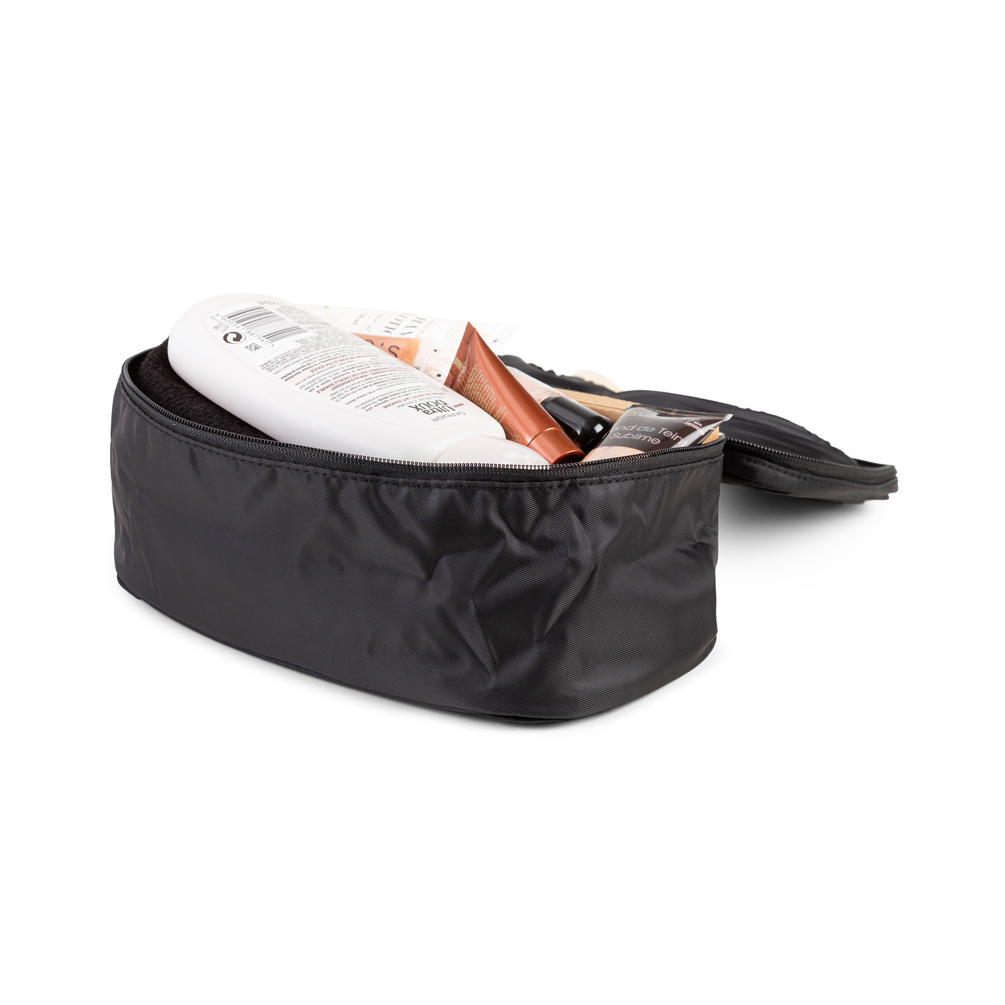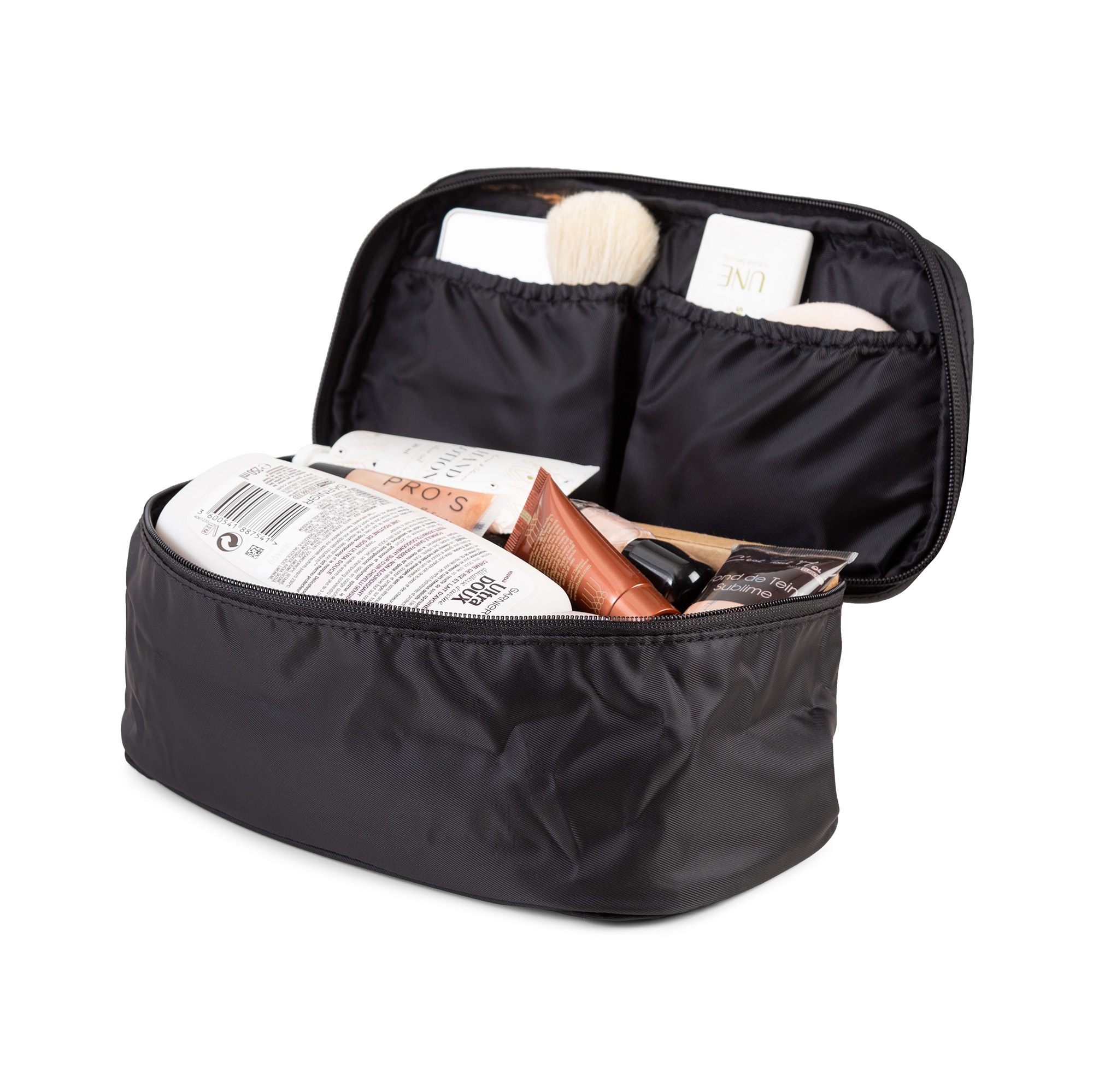Cette trousse de toilette a le format idéal pour les voyages. De bonne contenance, elle permet d'emporter tout le nécessaire tout en se casant facilement dans la valise. On peut aussi l'utiliser pour ranger et isoler la lingerie, les ceintures ou les foulards sans encombrer son bagage. La poignée rend le transport pratique, les 2 pochettes intérieures optimisent encore les possibilités de rangement. Toile noire 100 % polyester.