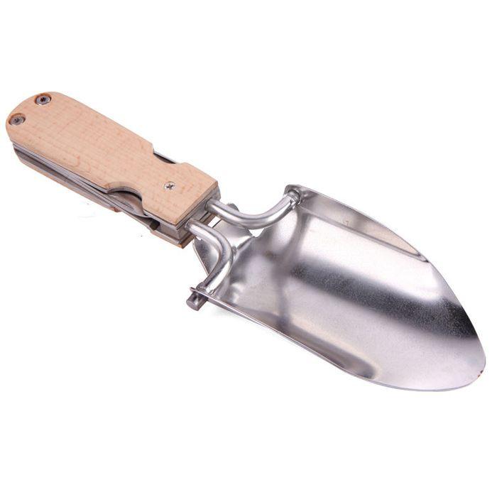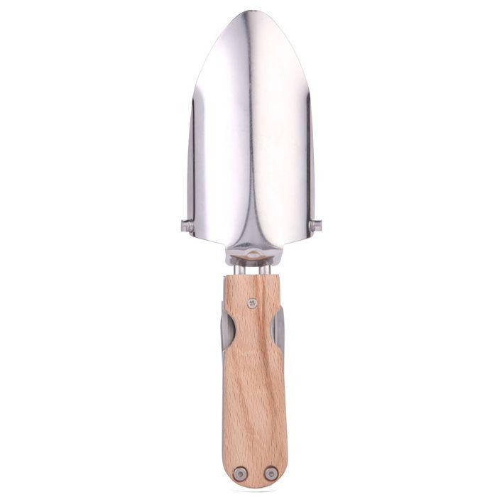 Truelle de jardin multifonctions Ce kit multi-outils de jardin comprend: truelle, désherbeuse, petite scie, couteau désherbeur, lame d'élagage simple. Matériaux : acier inoxydable, bois de hêtre. Dimensions (fermé) 6,6 x 14,5 x 2,5 cm, (ouvert) 18,4 x 23 x 2,5 cm.