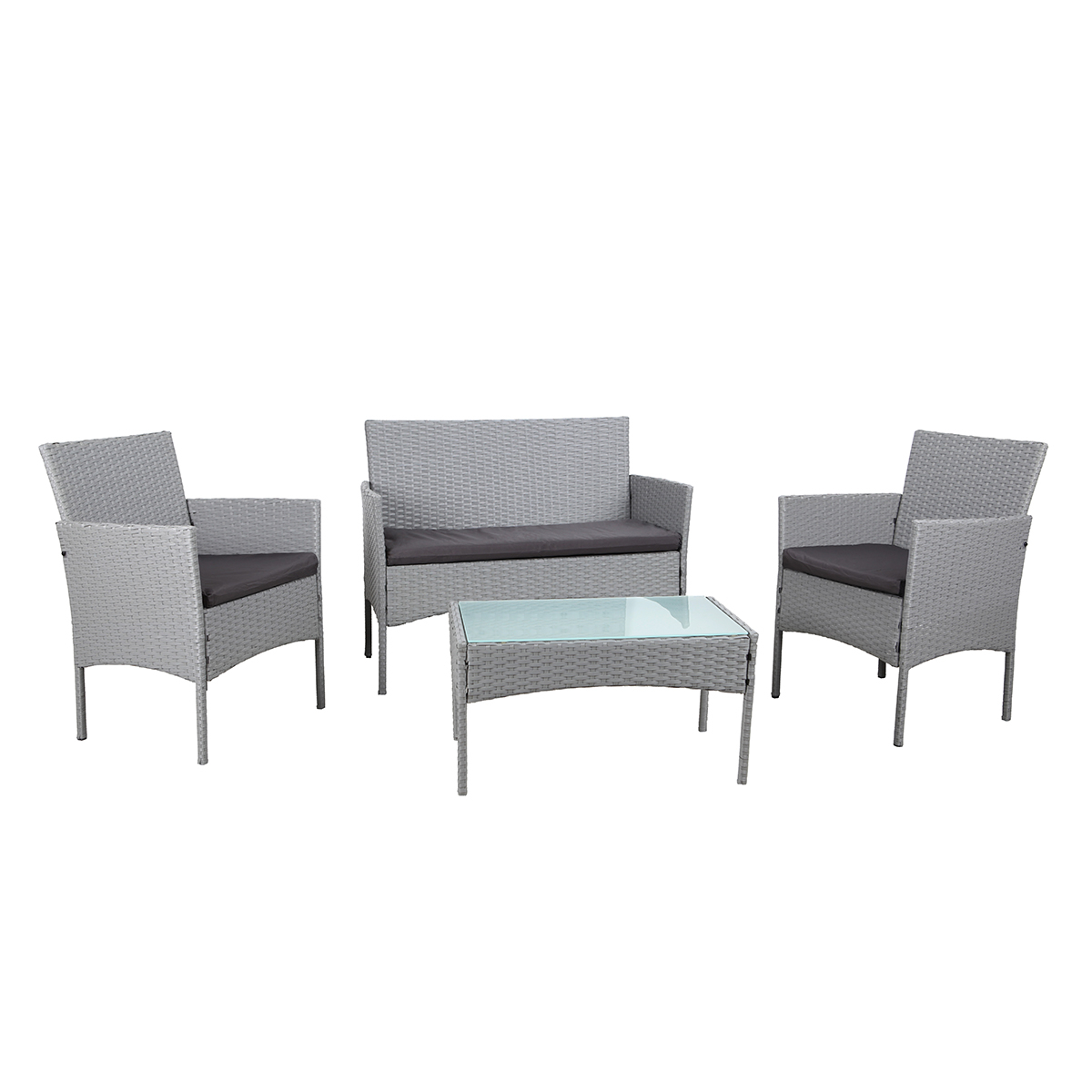Salon de jardin en résine tressée 4 places, composé d'un canapé, de deux fauteuils et d'une table basse avec plateau en verre trempé. Idéal pour les petits espaces, il est léger et facile à déplacer. Moderne et confortable, il s'intégrera parfaitement à votre jardin, votre terrasse ou votre balcon. Ses coussins épais vous permettront de vous relaxer dans un confort d'assise optimum, pour vous détendre ou partager des moments conviviaux entre amis.