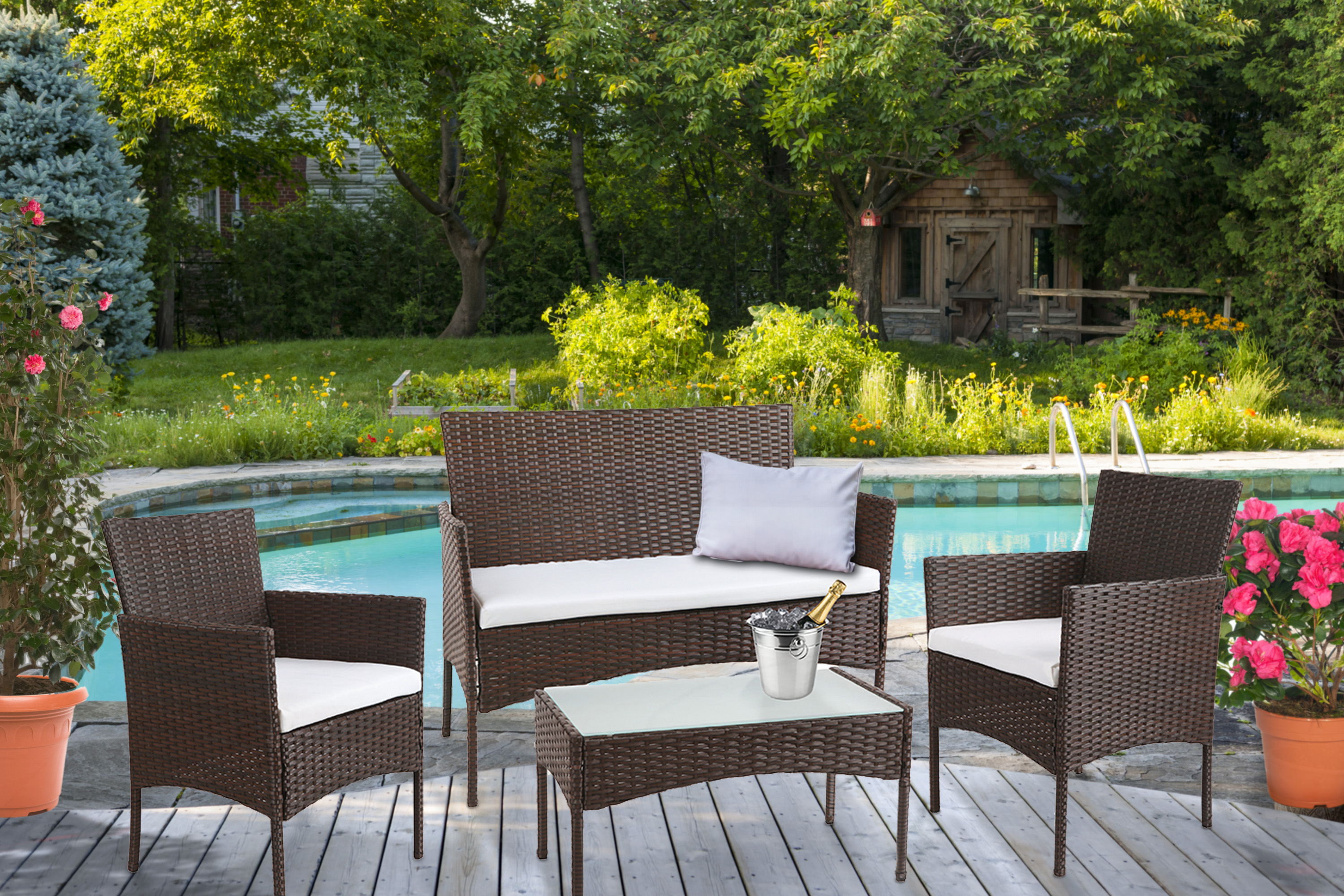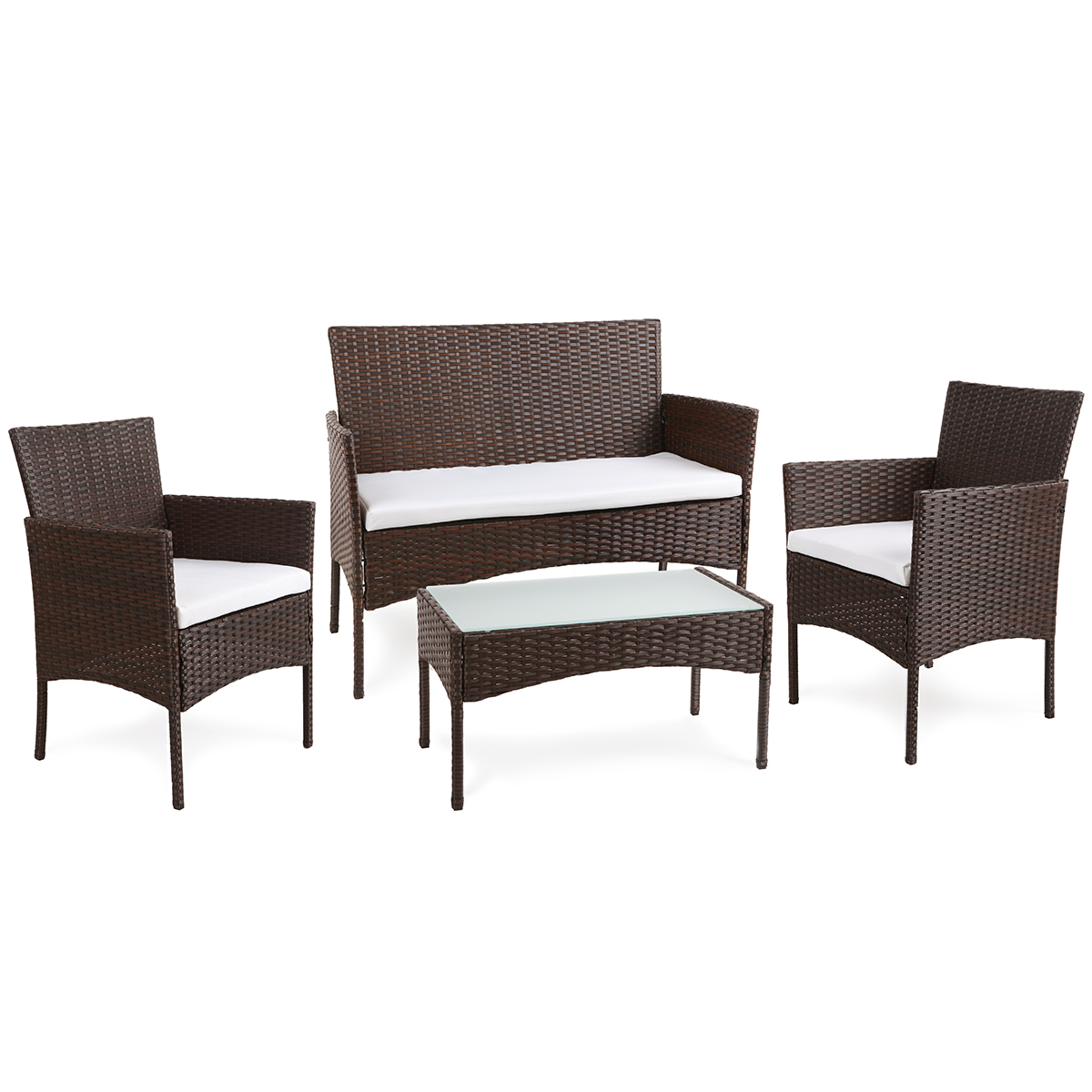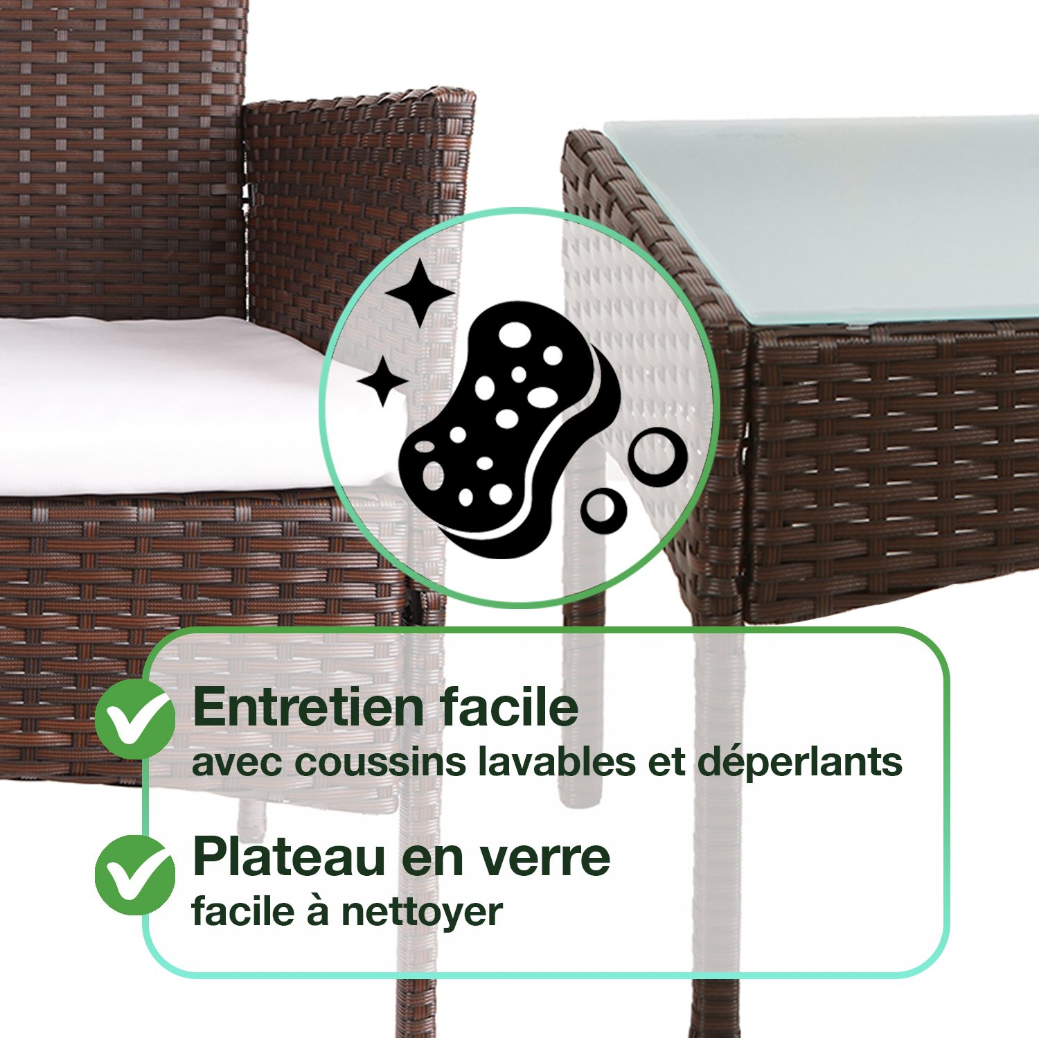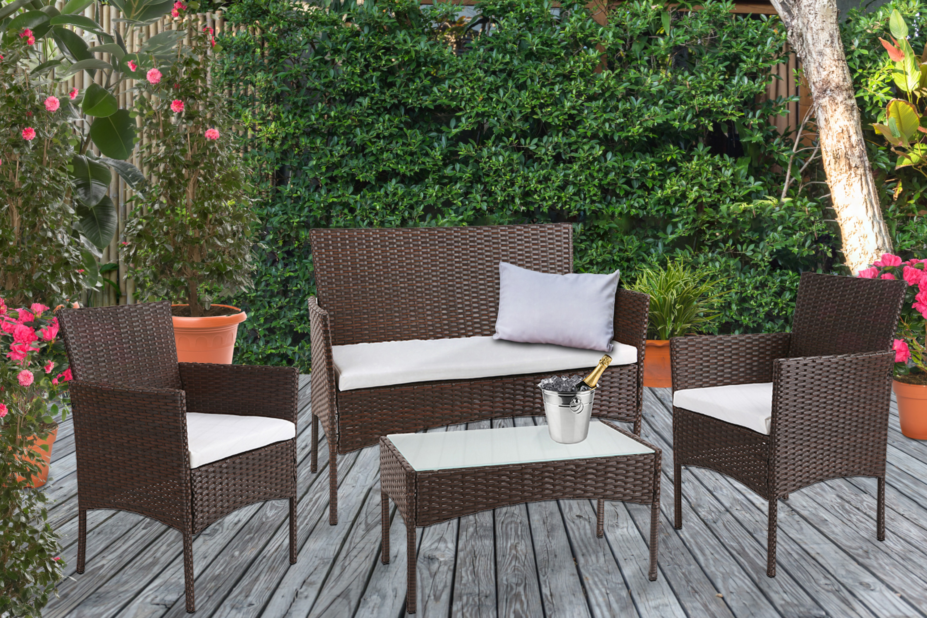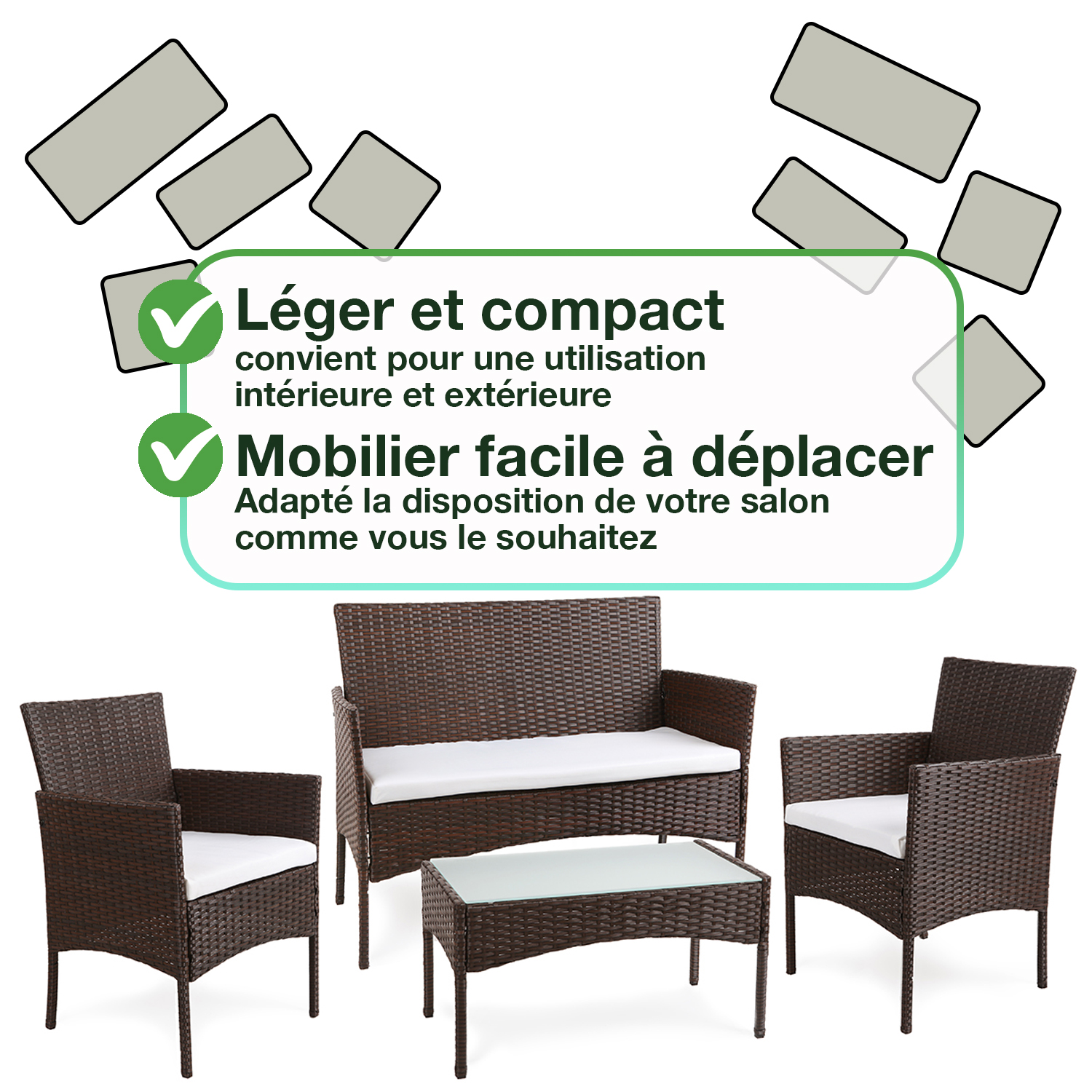 Salon de jardin en résine tressée 4 places, composé d'un canapé, de deux fauteuils et d'une table basse avec plateau en verre trempé. Idéal pour les petits espaces, il est léger et facile à déplacer. Moderne et confortable, il s'intégrera parfaitement à votre jardin, votre terrasse ou votre balcon. Ses coussins épais vous permettront de vous relaxer dans un confort d'assise optimum, pour vous détendre, lire un livre, ou partager des moments conviviaux entre amis. Ce salon est conçu pour être utilisé toute l'année en extérieur, grâce à sa structure en acier galvanisé qui le protège contre les intempéries et la corrosion. Son design chic et élégant apportera une ambiance cosy et chaleureuse également en intérieur, dans une véranda par exemple.