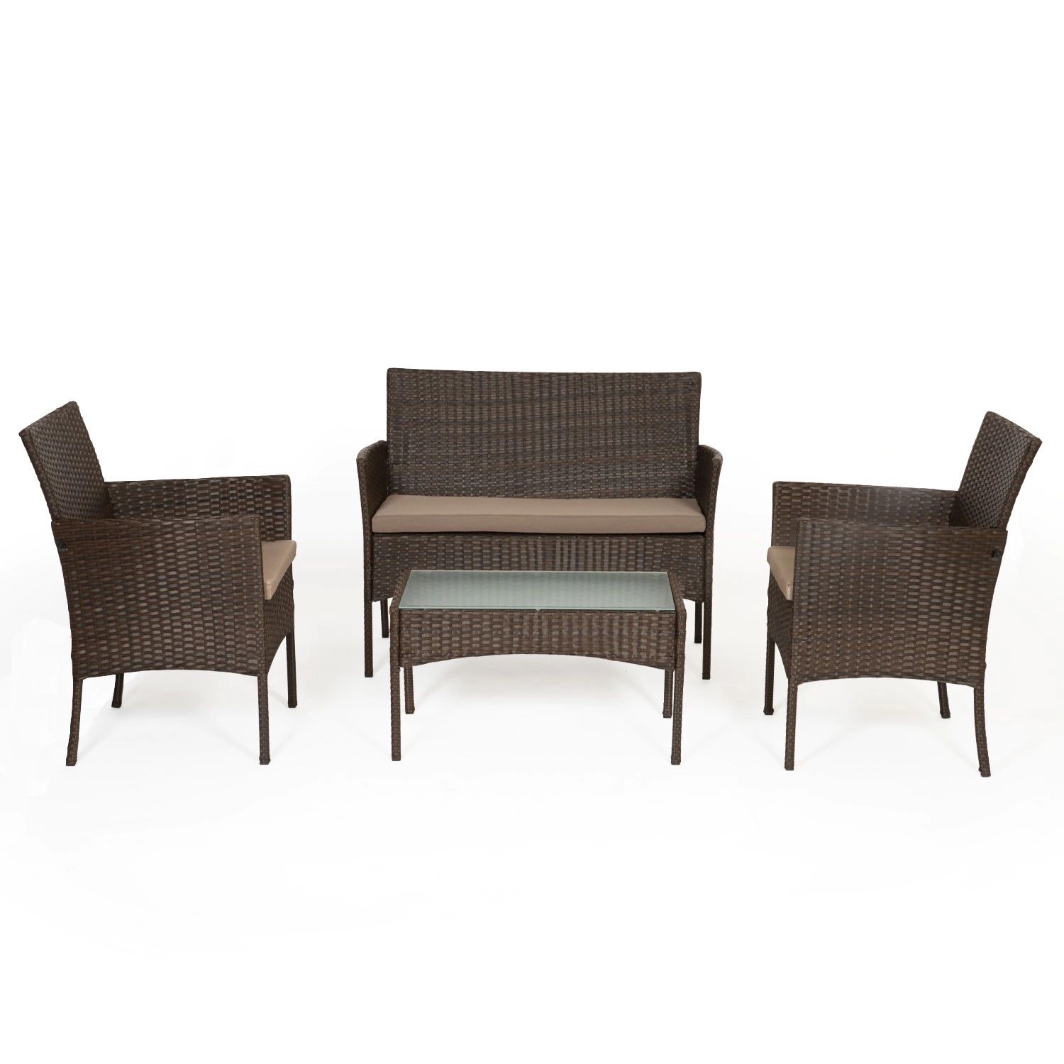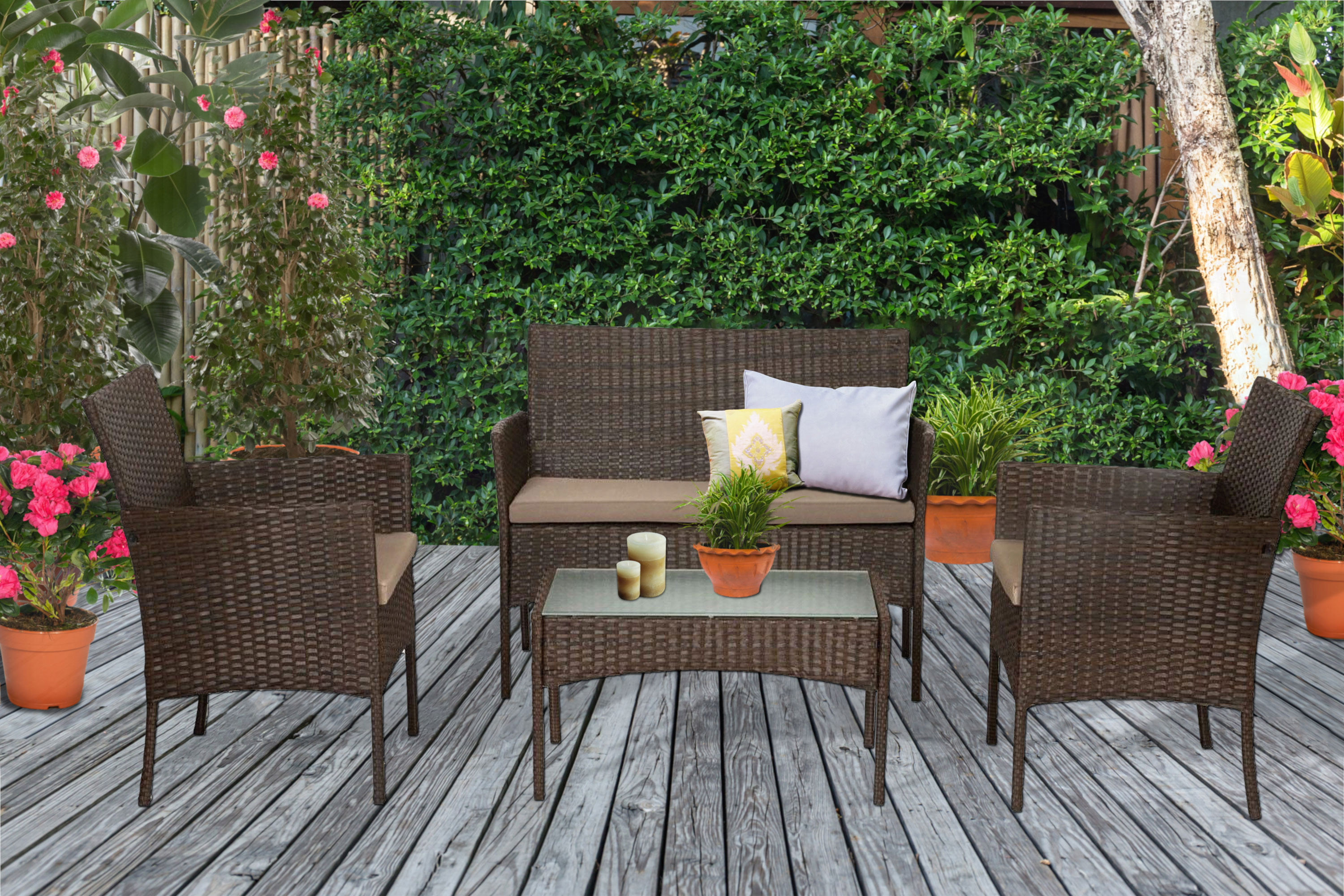 Salon de jardin en résine tressée 4 places, composé d'un canapé, de deux fauteuils et d'une table basse avec plateau en verre trempé. Idéal pour les petits espaces, il est léger et facile à déplacer. Moderne et confortable, il s'intégrera parfaitement à votre jardin, votre terrasse ou votre balcon. Ses coussins épais vous permettront de vous relaxer dans un confort d'assise optimum, pour vous détendre, lire un livre, ou partager des moments conviviaux entre amis. Ce salon est conçu pour être utilisé toute l'année en extérieur, grâce à sa structure en acier galvanisé qui le protège contre les intempéries et la corrosion. Son design chic et élégant apportera une ambiance cosy et chaleureuse également en intérieur, dans une véranda par exemple.