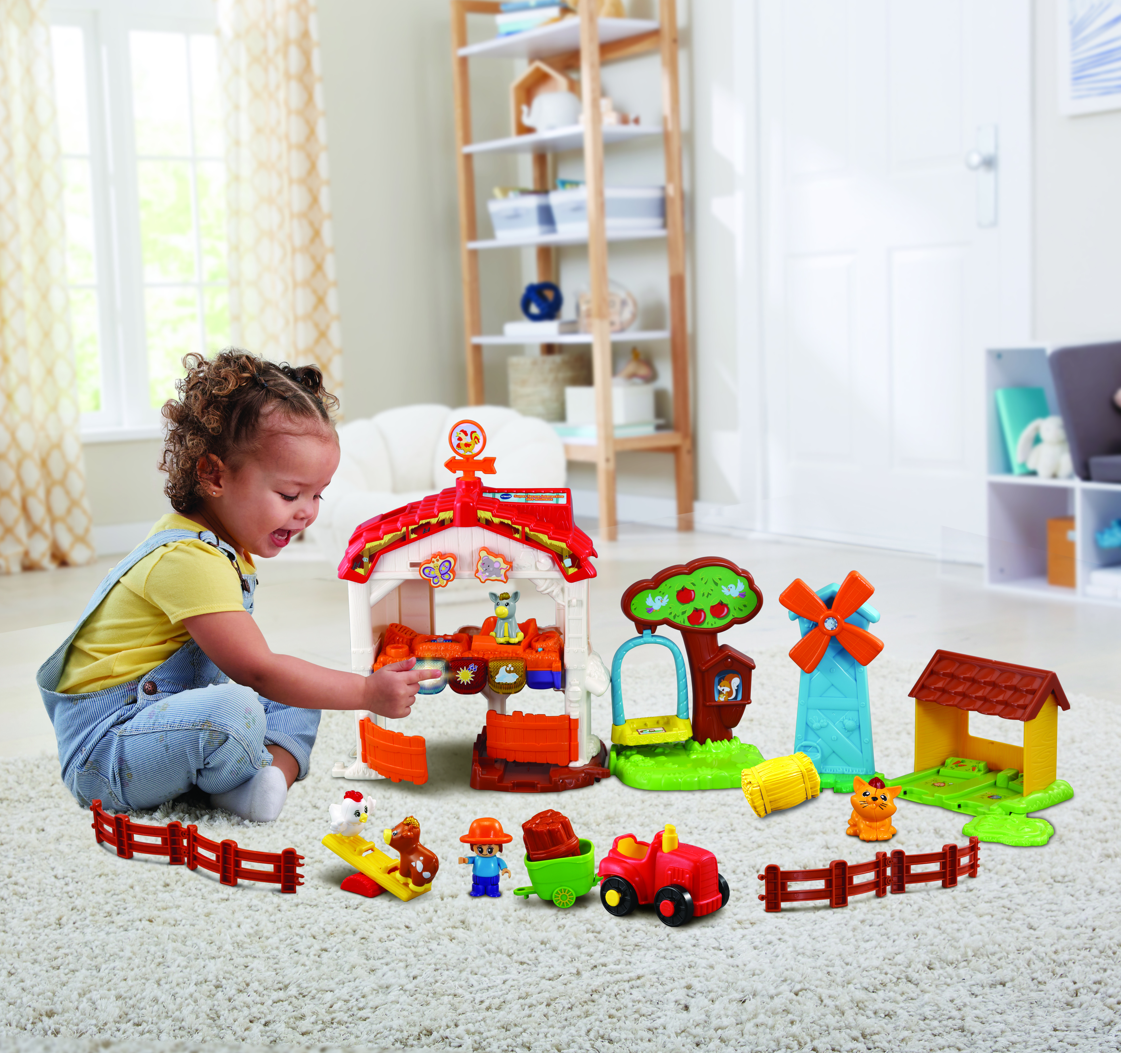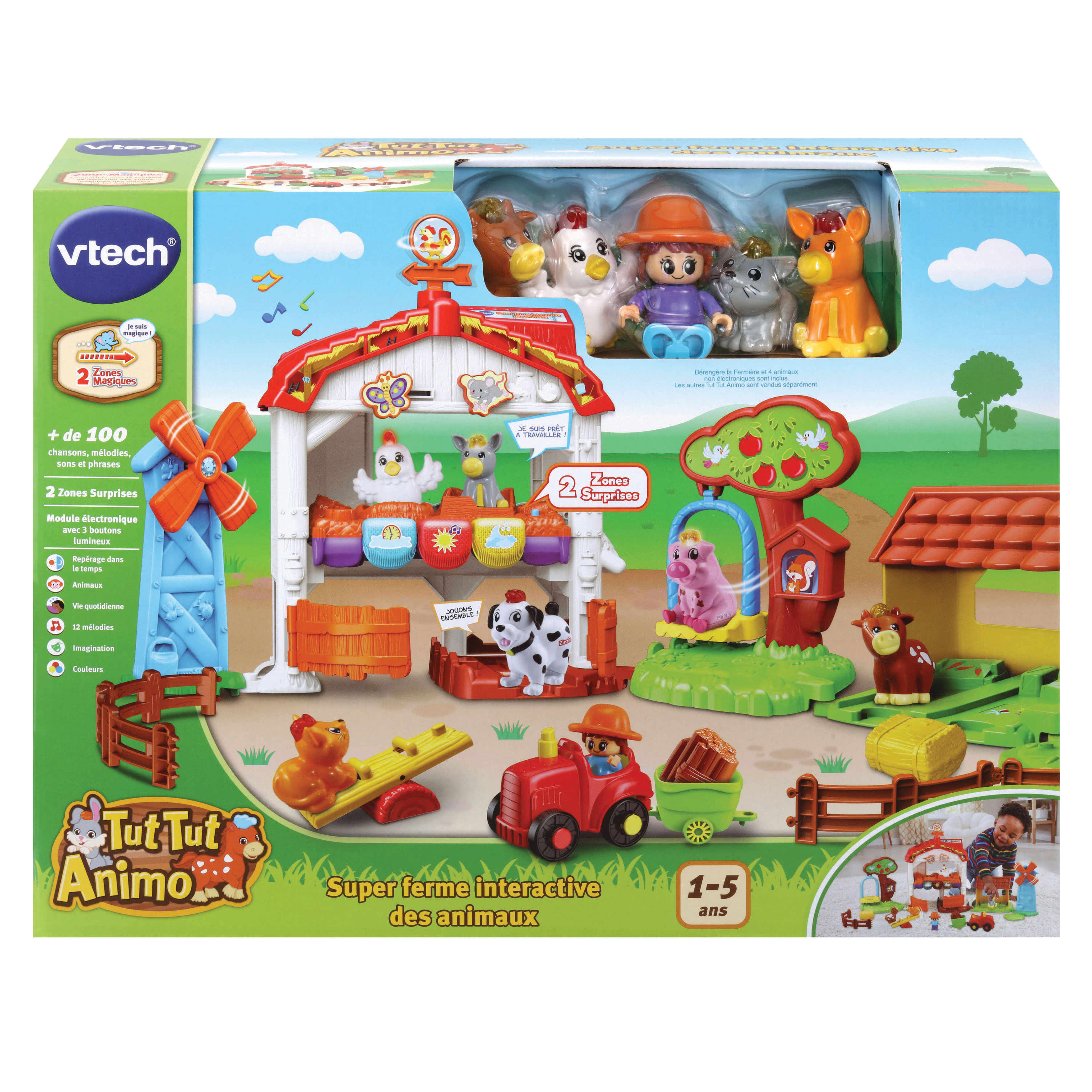 Tut Tut Animo - Super ferme interactive des animaux - 1 - 5 ans L’enfant donne vie aux 4 animaux inclus en les plaçant sur les 2 zones de reconnaissance. Ils se présentent et leur houppette s’illumine ! Trois boutons lumineux pour en apprendre plus sur les couleurs, la météo et les aliments. Super ! Le panneau interactif est détachable et permet d’agrandir la ferme ! L’enfant peut l’utiliser en mode horizontal pour jouer avec les zones de reconnaissance ou en mode latéral pour découvrir une étable pour les animaux ! Une fermière avec tracteur et remorque inclus pour transporter le bois ou la paille De nombreux éléments à manipuler : balançoires, portes de la ferme, engrenages, girouette et bien plus encore ! 2 Zones Magiques & 2 Zones de reconnaissance 3 chansons et 12 mélodies Compatible avec les Tut Tut Animo et Tut Tut Bolides. Arrêt automatique. Fonctionne avec 2 piles LR03/AAA non fournies