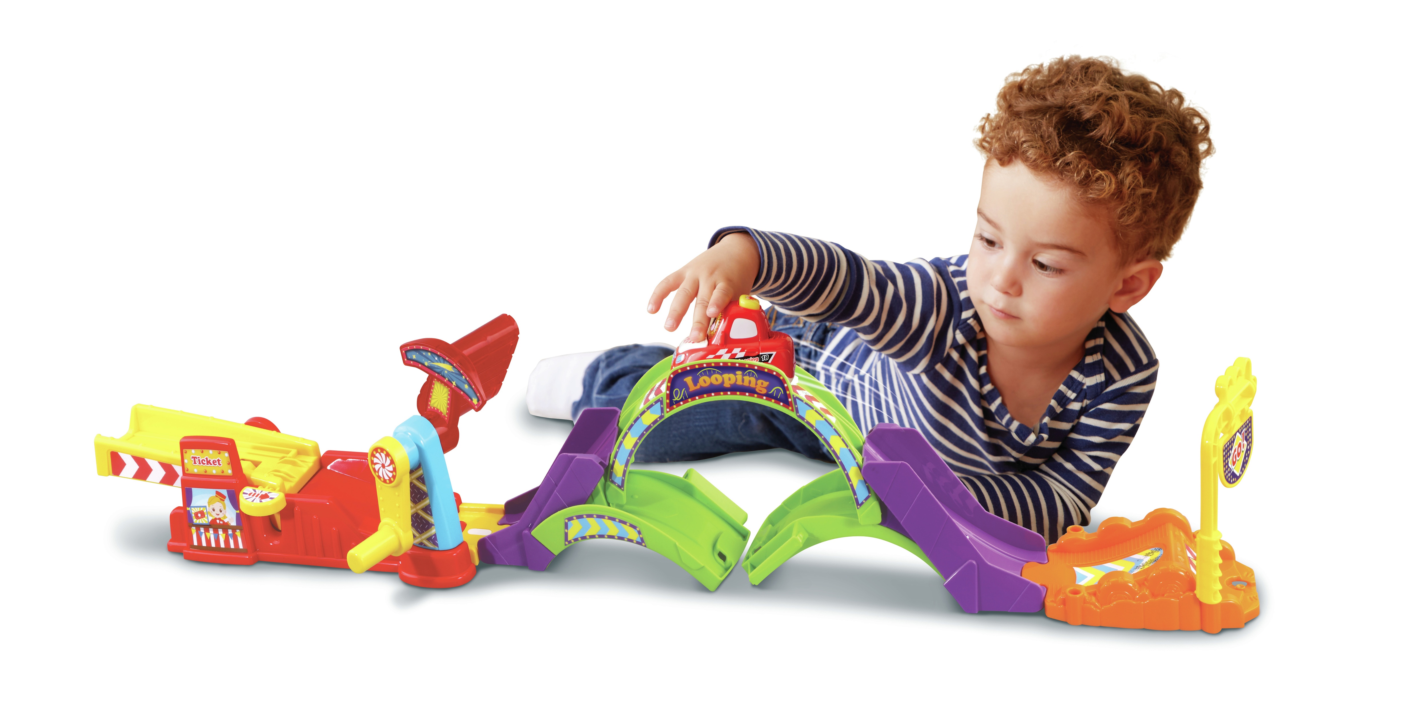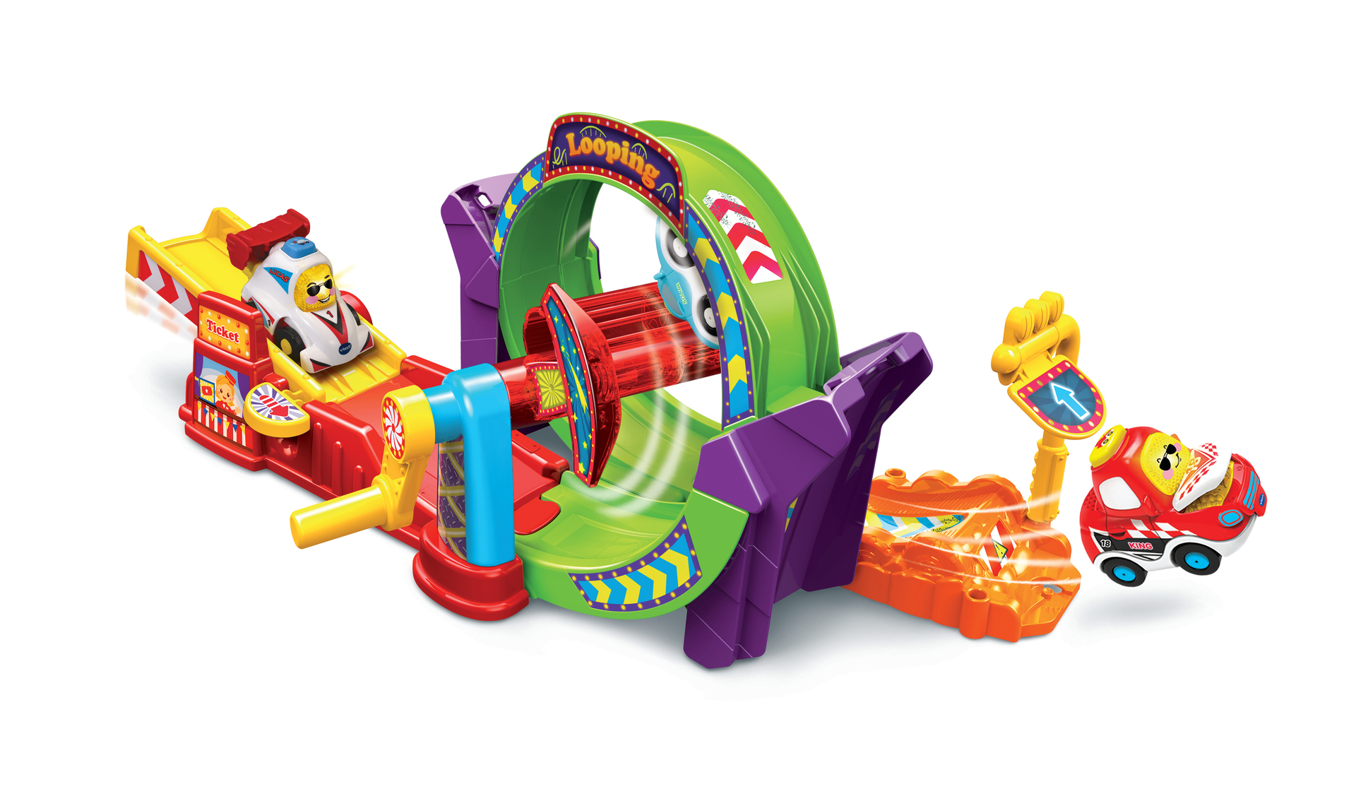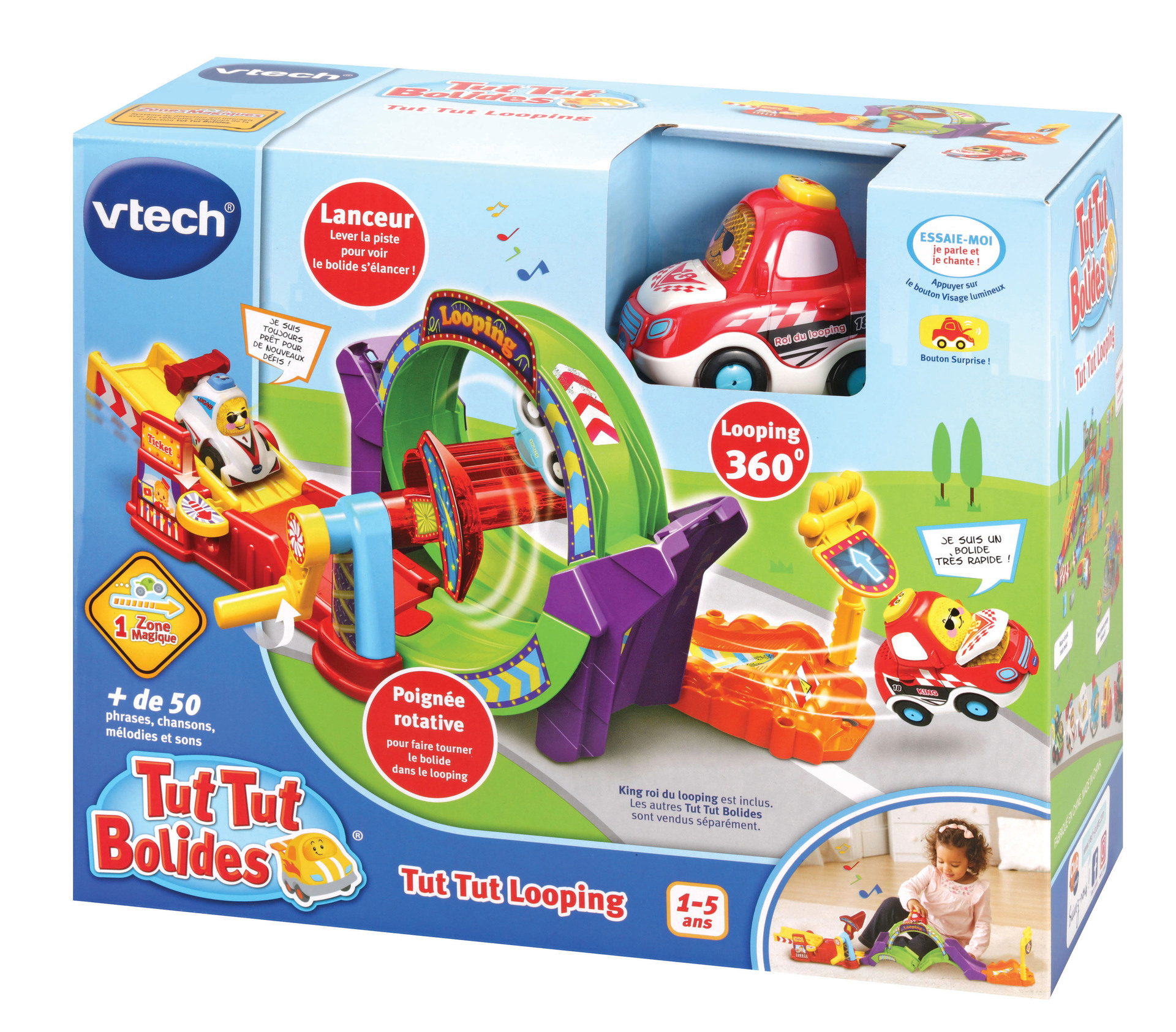 Tut Tut Bolides – Tut Tut Looping (+King roi du looping) - 1 - 5 ans Deux combinaisons possibles de pistes pour un maximum de jouabilité : - Un looping 360° - Une descente vertigineuse ! Un tremplin et une manivelle pour propulser le véhicule King le roi du looping à toute vitesse dans un super looping Le véhicule électronique inclus déclenche des phrases et des sons amusants lorsqu'il passe au-dessus de la zone Magique. 1 Zone Magique 3 chansons et 6 mélodies Fonctionne avec 2 piles LR03 incluses