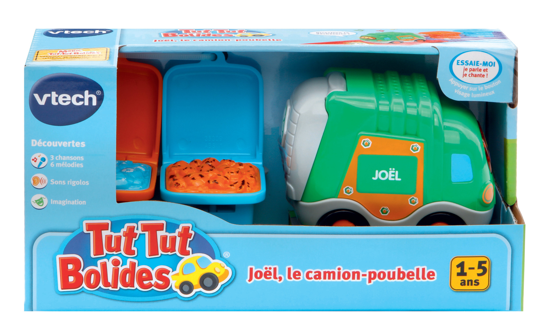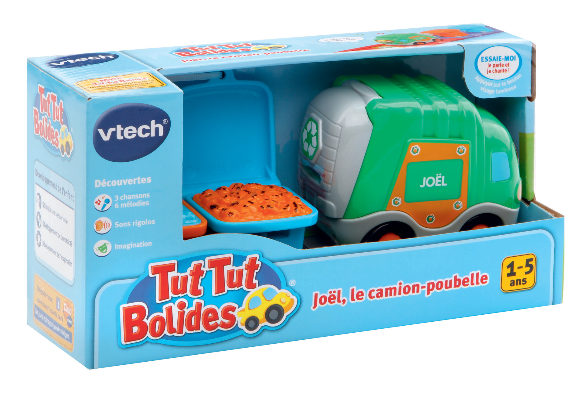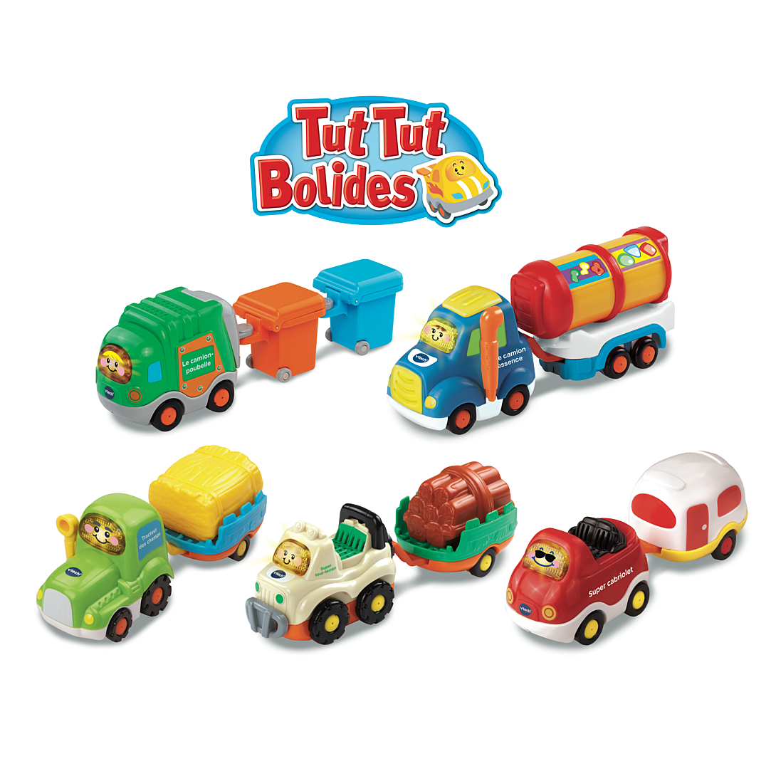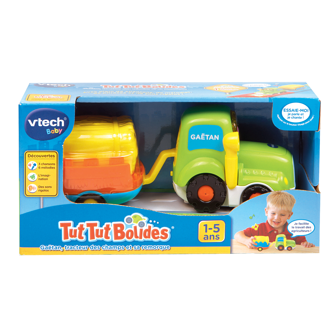 Tut Tut Bolides - Véhicules avec remorque - 1 - 5 ans D'adorables petites voitures parlantes, musicales et lumineuses avec leur remorque détachable ! Bébé peut ouvrir la fenêtre de la caravane ou faire tourner les deux parties de la citerne d'essence. Les Tut Tut Bolides accompagnent Bébé dans ses premières découvertes : nom, fonctions et particularités de chacun des véhicules, développement de la motricité… 3 chansons rigolotes et 6 mélodies par véhicule. Les véhicules sont compatibles avec le système de détection « Zone magique » qui déclenche des phrases et des effets sonores supplémentaires. Les différentes remorques peuvent être rattachées à tous les véhicules Tut Tut Bolides. Différents modèles : - Gaëtan, tracteur des champs et sa remorque x 1 - Timothée, super cabriolet et sa caravane x 1 - Robin, super tout-terrain et sa remorque x 1 - Maxence, le camion à essence et sa semi remorque x 1 - Joël, le camion poubelle x 2 Boîte Try-me. 2 piles LR03 fournies par véhicule.