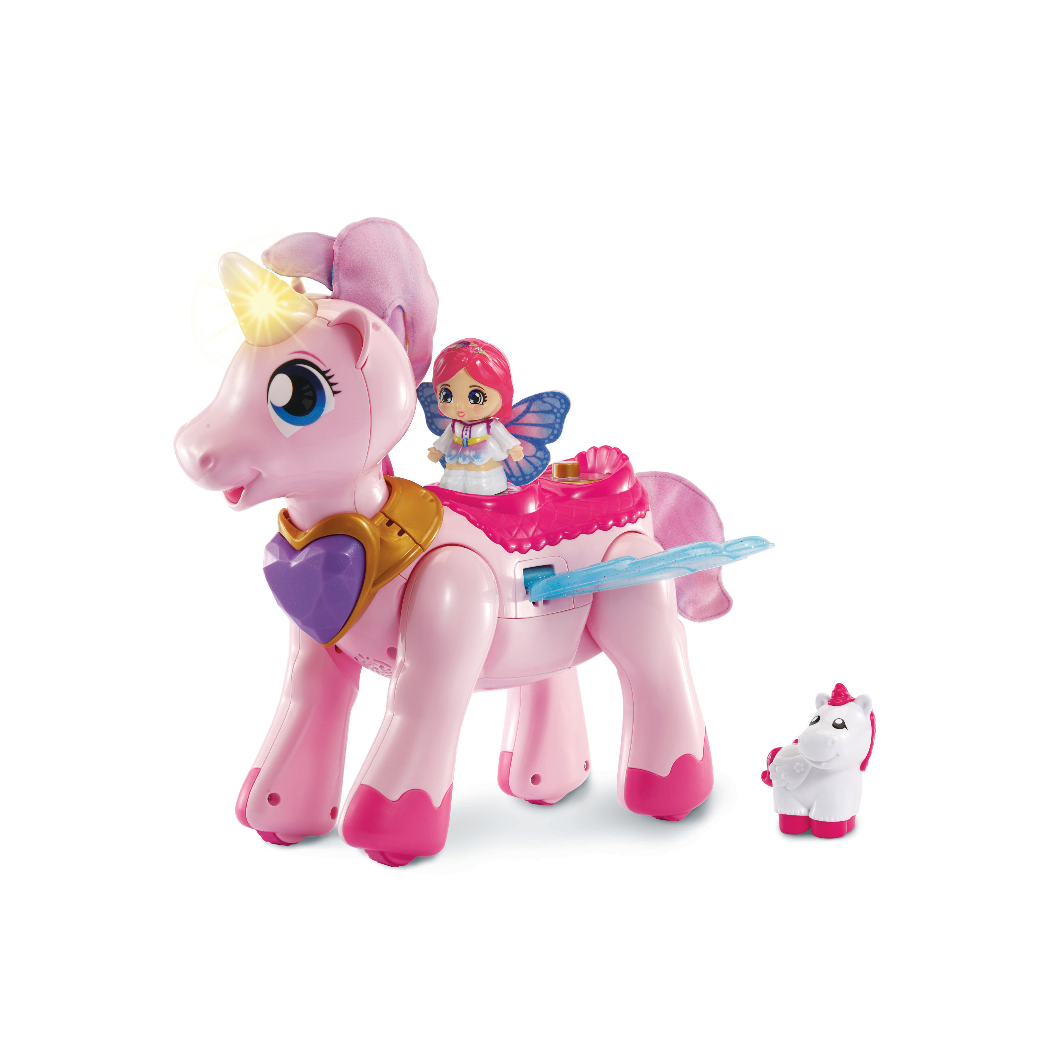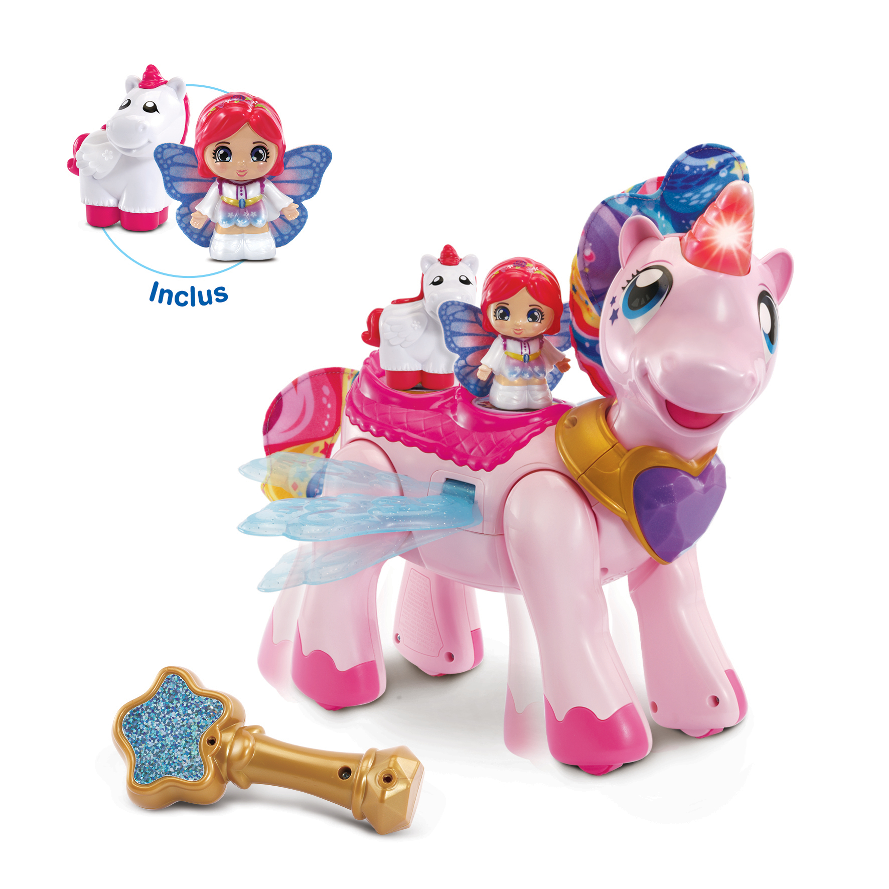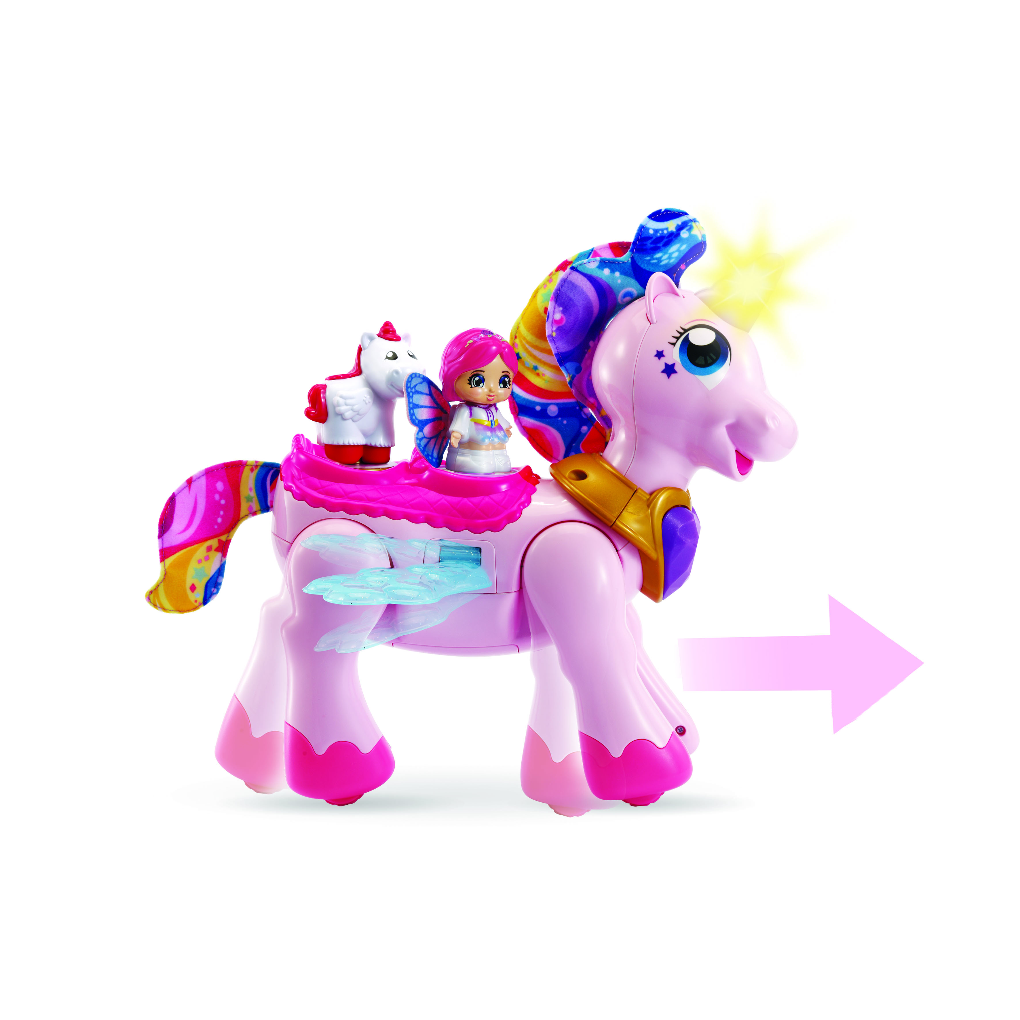 Tut Tut Copains - Cléophée, ma licorne enchantée - 1 - 5 ans Magique, quand on secoue la baguette magique, Cléophée la licorne avance, bouge la tête et bat des ailes. Super, sa corne s’illumine de différentes couleurs ! Cléophée se déplace également quand on place Melody fée jolie sur son dos ou quand on appuie sur son cœur. Un Tut Tut Copains inclus « Melody fée jolie » qui interagit quand on la place sur le dos de la licorne. Ses ailes colorées sont en tissu tout doux La crinière et la queue de la licorne sont en tissu. Lili le bébé licorne est inclus pour jouer ! 1 Rond Magique Compatible avec tous les personnages Tut Tut Copains. 5 chansons et 12 mélodies Arrêt automatique. Boîte Try-me 4 piles LR6/AA fournies